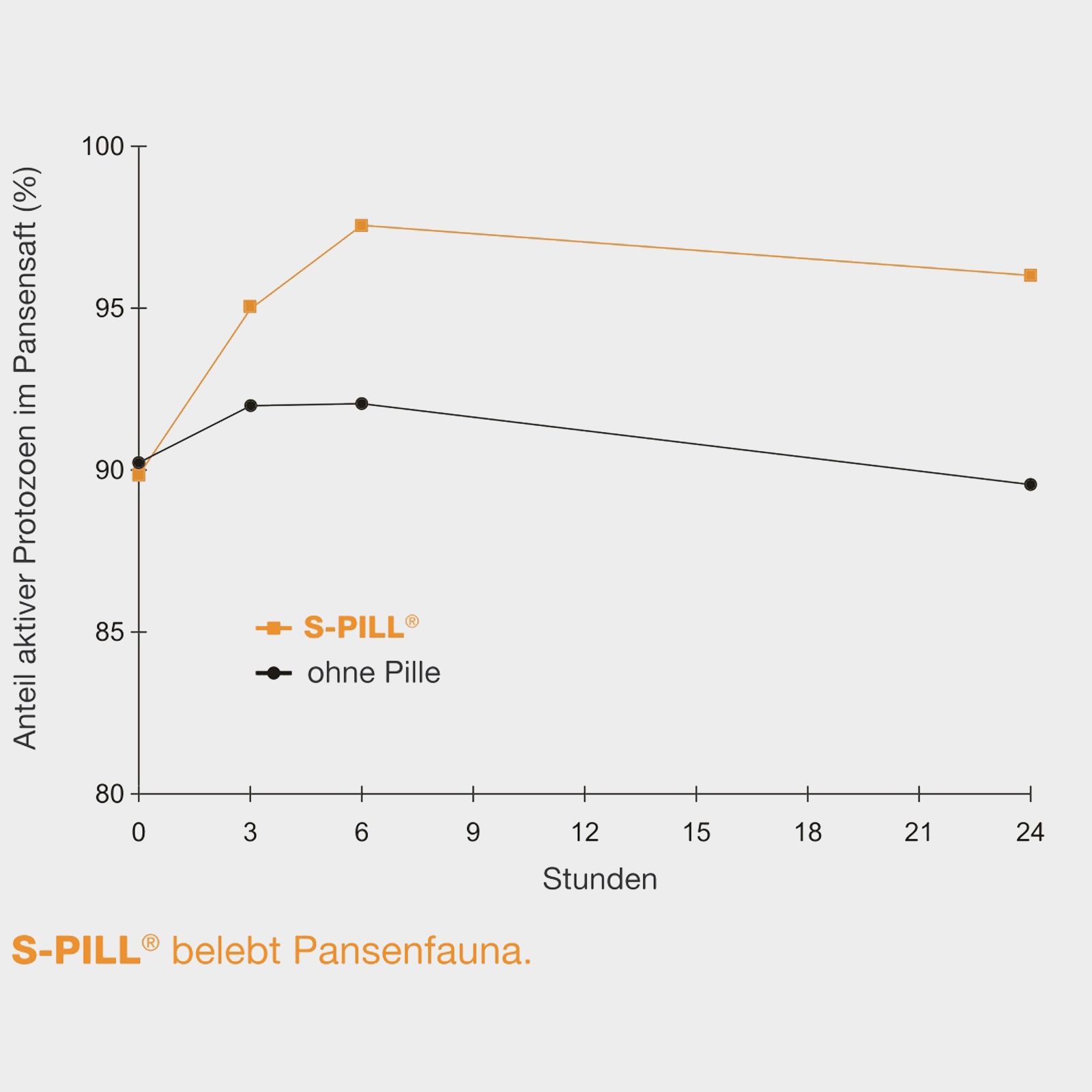 S-PILL este un excelent stimulent energetic pentru vaca dumneavoastră. Preparatul oferă energie de înaltă calitate și stimulează rumenul. Pastila de stimulare a rumenului, fabricată din propionat de sodiu, este ideală în cazul conversiei furajelor sau al pierderii poftei de mâncare. Testele științifice au arătat că S-PILL revitalizează flora și fauna ruminală și furnizează energie până la 24 de ore de la administrare.