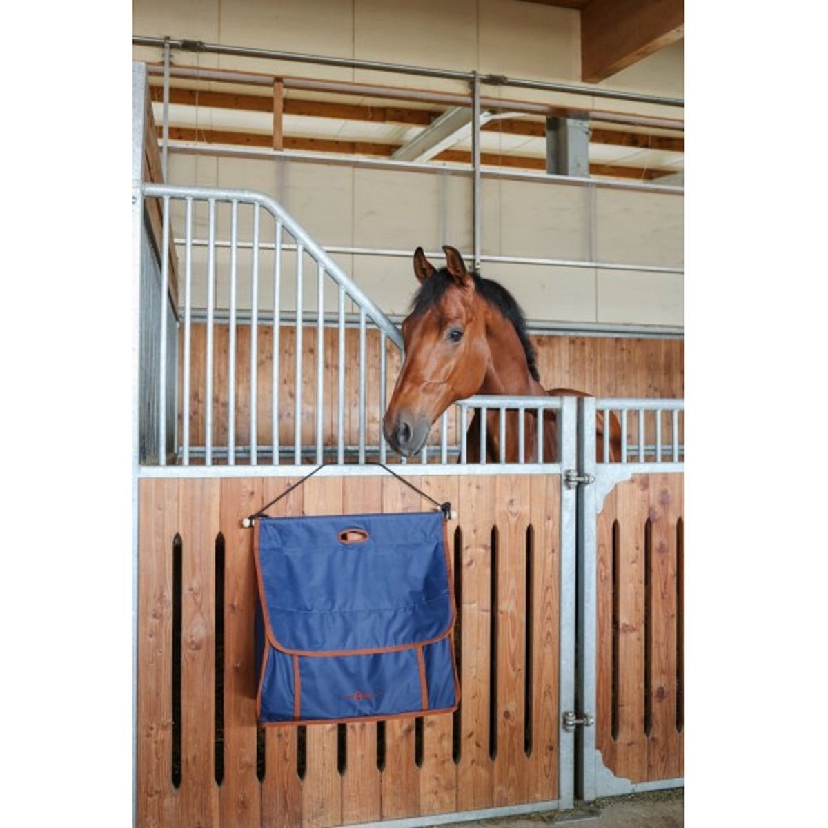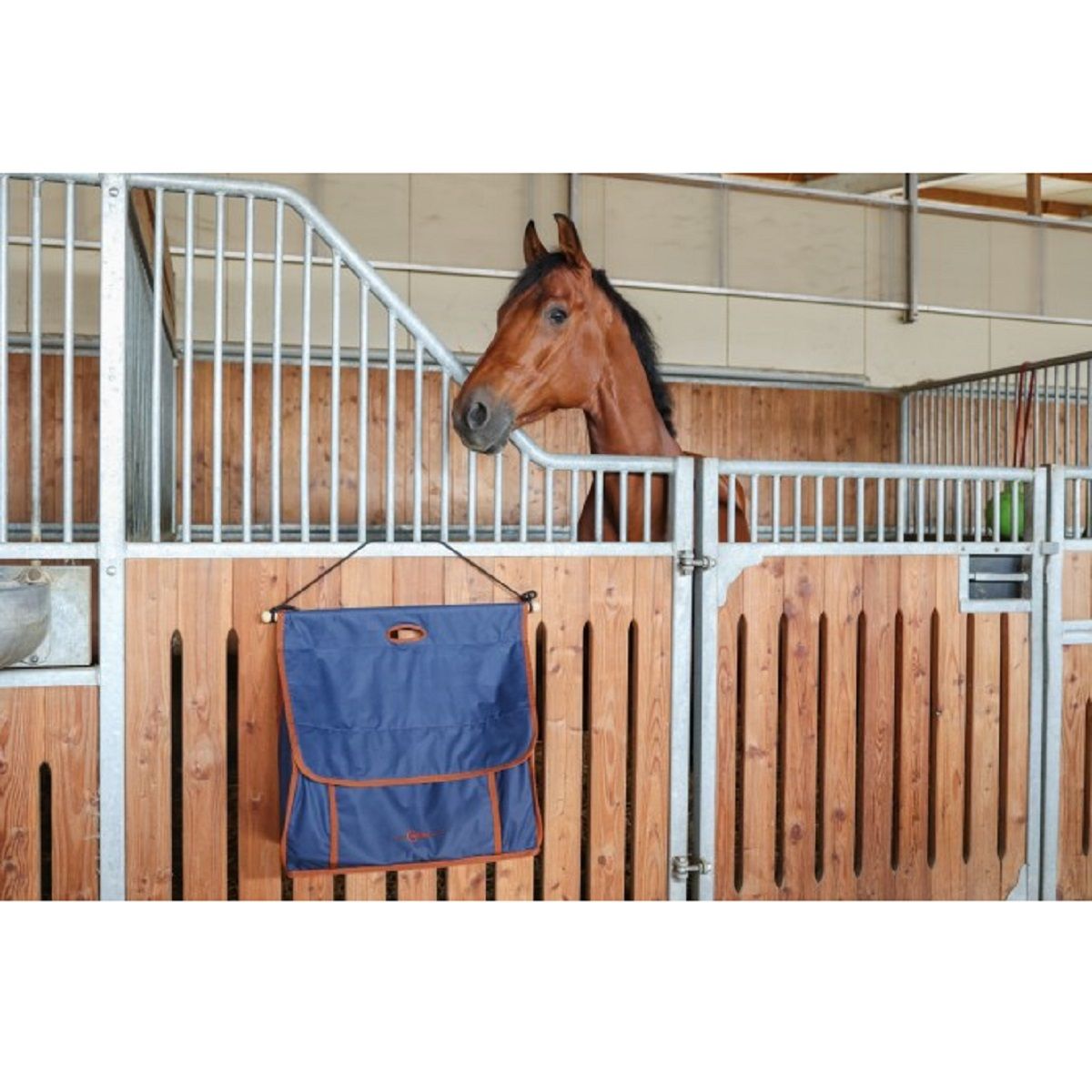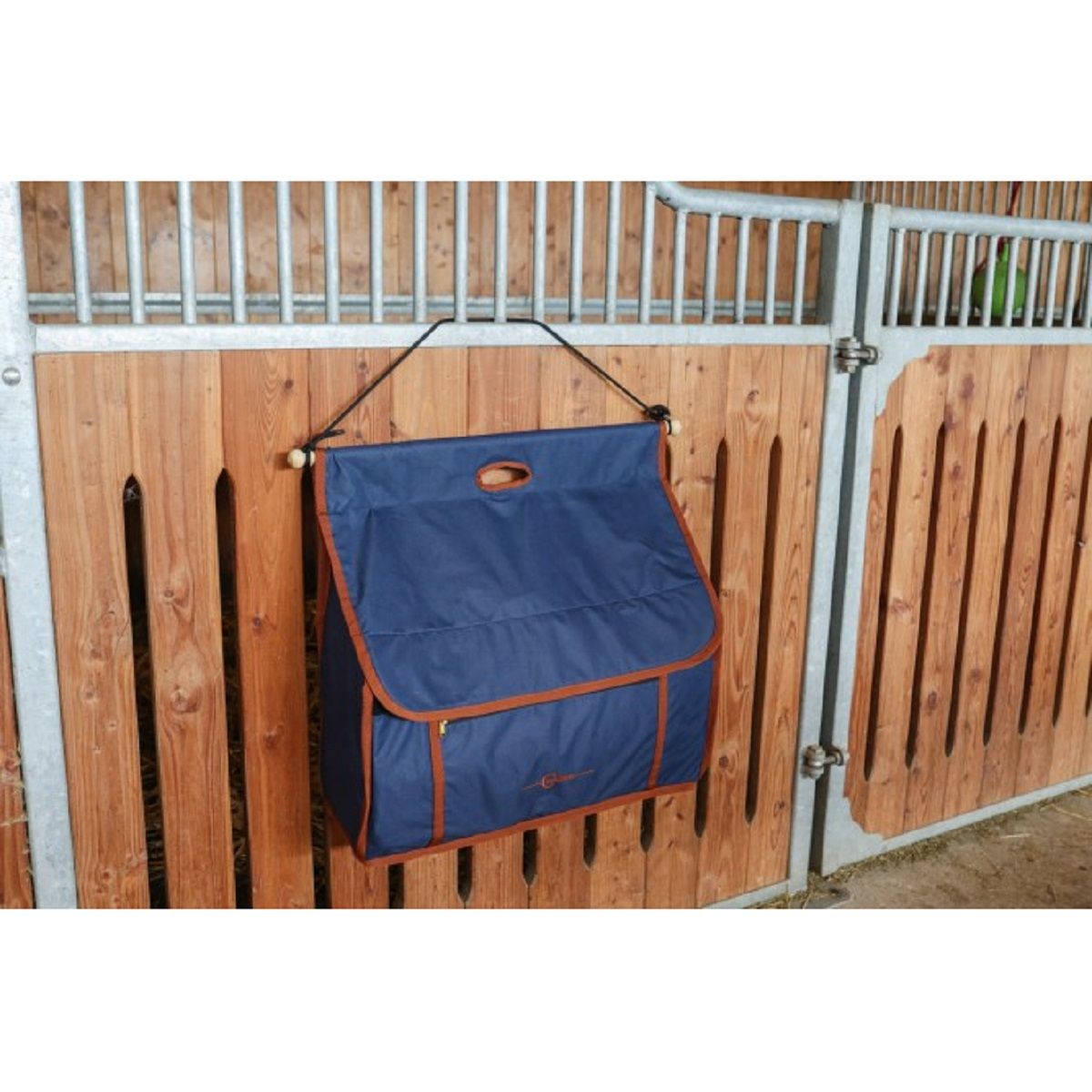 Geanta robustă și practică Milano oferă o depozitare curată și ordonată pentru echipamentul de îngrijire, spray-uri, cizme, haletere, clopoței etc. în grajd și la expoziție. Spațiul amplu de depozitare face posibilă depozitarea multor ustensile diferite. Geanta pentru boxa de cal este fabricată dintr-un material respingător de murdărie, ușor de întreținut și robust, ideal pentru utilizarea în grajd. Țesătura oxford impermeabilă protejează, de asemenea, conținutul de ploaie și murdărie. Atunci când geanta de toaletare nu este folosită, capacul poate fi închis cu o închizătoare Velcro. Datorită bățului din lemn și a fundului și pereților stabili, geanta de toaletare poate fi atârnată într-o formă stabilă. Punga pentru boxe de cai este foarte ușor de atașat la barele boxelor de cai.