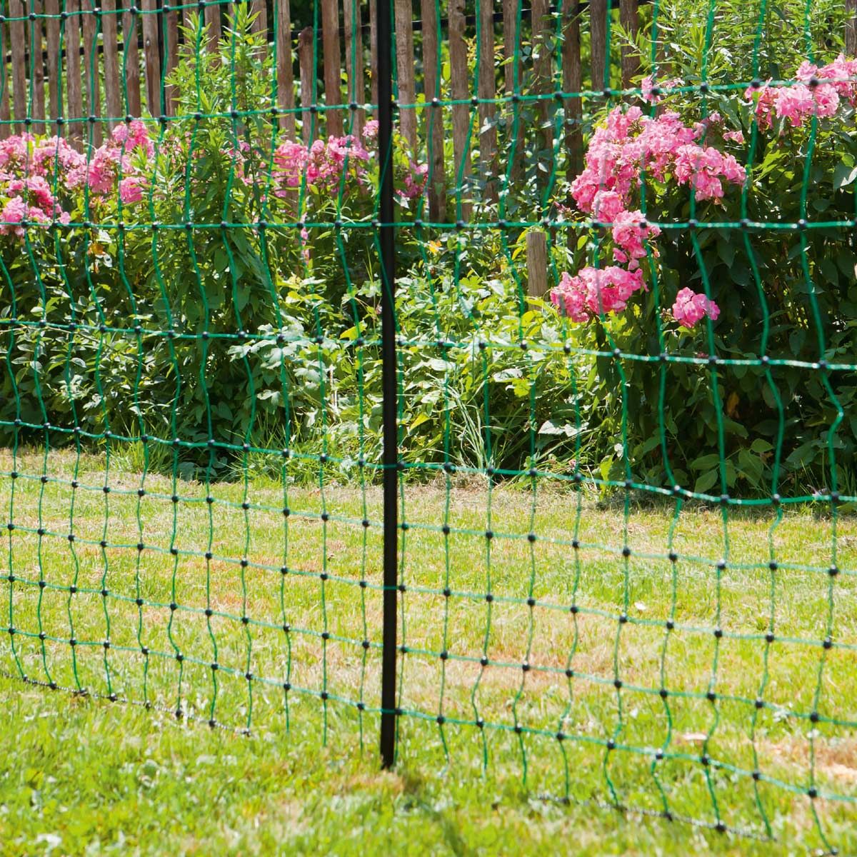 Țărușii din plastic robust, cu vârfuri individuale, asigură că gardul de pășune rezistă bine pe teren accidentat sau pietros. Proprietățile bune de pășunat sunt asigurate în plus de un sigiliu de plastic la fiecare punct de intersecție a ochiurilor de plasă, care este sudat inamovibil. Gardul este prevăzut cu un fir verde, ceea ce îl face să se integreze în mod deosebit de armonios în mediul înconjurător. Pentru o stabilitate suplimentară, vă recomandăm să plasați un stâlp de lemn în fiecare colț al plasei.