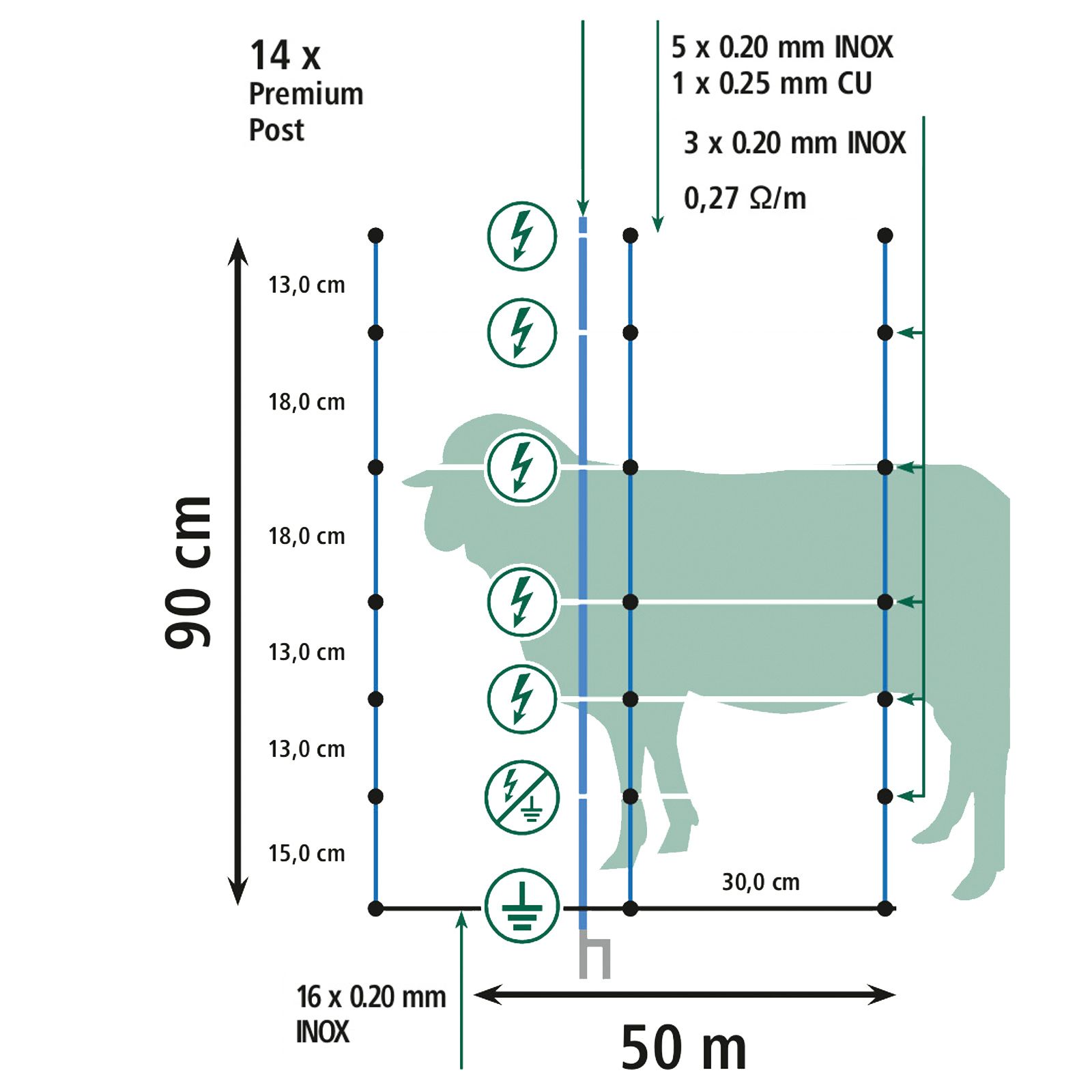 Firul superior întărit, purtător de curent, asigură o conductivitate ridicată prin utilizarea a 5 conductori din oțel inoxidabil și a unui conductor din cupru stins. Un fir de împământare întărit, care poate fi conectat opțional, pentru legarea la pământ pe întreaga lungime a plasei, este ideal pentru condiții de sol dificile (de exemplu, soluri foarte nisipoase sau uscate). 16 conductori din oțel inoxidabil, în combinație cu fire groase de PE în firul de sol, împiedică în mod eficient animalele sălbatice să se apropie de ele. În plus, cel de-al doilea fir deasupra solului este, de asemenea, echipat cu o clemă de conectare separată din oțel inoxidabil și poate fi astfel utilizat în mod flexibil. Un sigiliu din plastic la fiecare punct de intersecție a ochiurilor de plasă, care este sudat inamovibil, asigură, de asemenea, bunele proprietăți de înveliș.