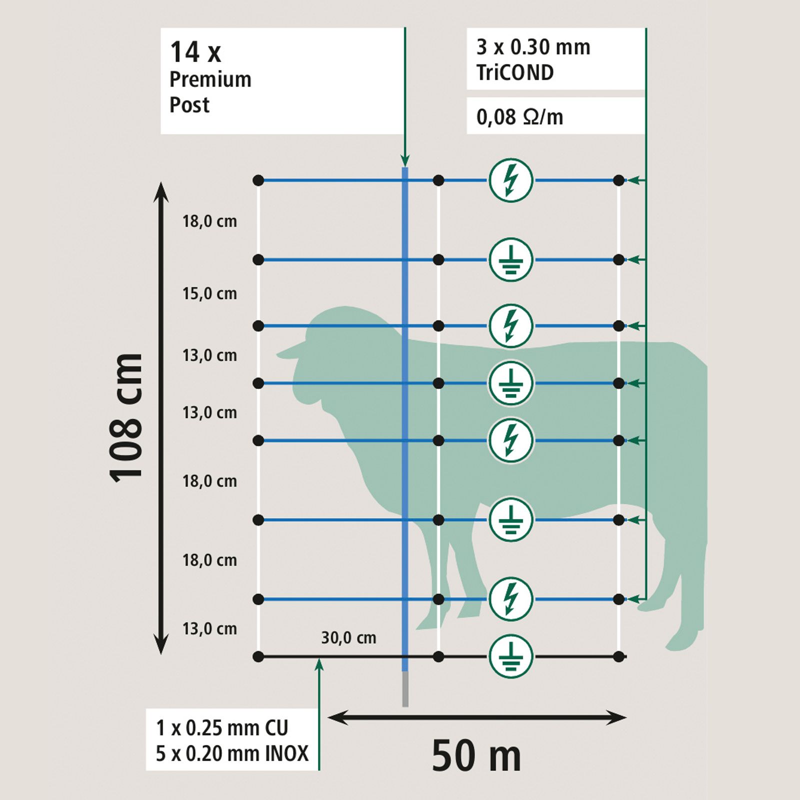 Plasa pentru gard anti lupi atinge o conductivitate excelentă prin conducerea orizontală a curentului cu 3 x 0,30 mm de material conductor TriCOND pe fir. Firele conductoare TriCOND sunt de 5 ori mai conductive decât firele convenționale din oțel inoxidabil de aceeași grosime și oferă astfel o protecție maximă a învelișului - chiar și pe distanțe lungi. Acoperirea specială a acestor fire conferă materialului robustețe și asigură o durabilitate îndelungată. Cablul de împământare întărit, care poate fi conectat opțional pentru împământare pe întreaga lungime a plasei, este optim pentru condiții de sol dificile (de exemplu, soluri foarte nisipoase sau uscate). Stâlpii verticali rezistenți sunt conectați permanent la stâlpii orizontali la intervale de 30 cm și asigură astfel un suport compact chiar și pe teren accidentat și neuniform.