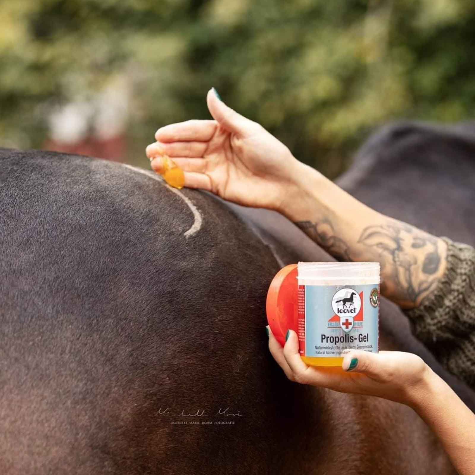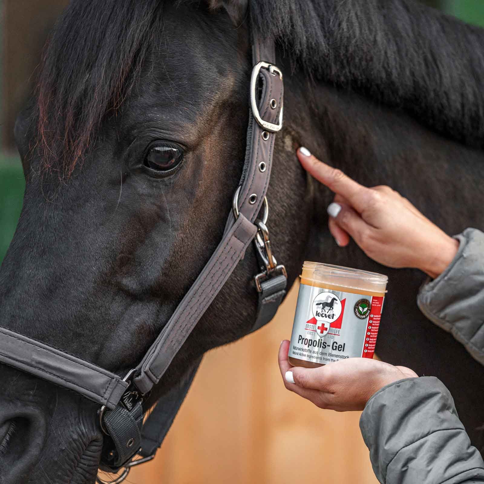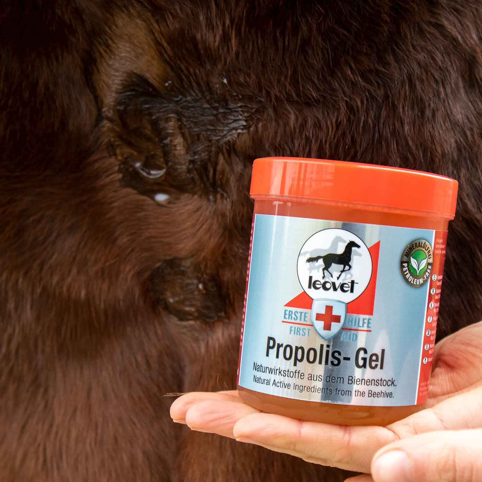 Leovet Propolis Gel pentru cai este un remediu natural pentru pielea deteriorată a calului. Datorită vitaminelor, rășinilor și oligoelementelor, este numit și antibioticul natural din stup. Uleiurile esențiale și componentele rășinoase ale propolisului au un efect antibacterian și favorizează vindecarea rănilor. Gelul de propolis ajută în cazul abceselor, eczemelor, mușcăturilor de insecte, rănilor mici ale pielii și fisurilor. Aplicarea gelului de propolis pe șa și pe presiunea din șa și chingă face, de asemenea, minuni, redă suplețea pielii și permite vindecarea cât mai rapidă a zonelor afectate. Ingredientul activ natural propolis hrănește, calmează și îmbunătățește funcția de protecție a pielii.