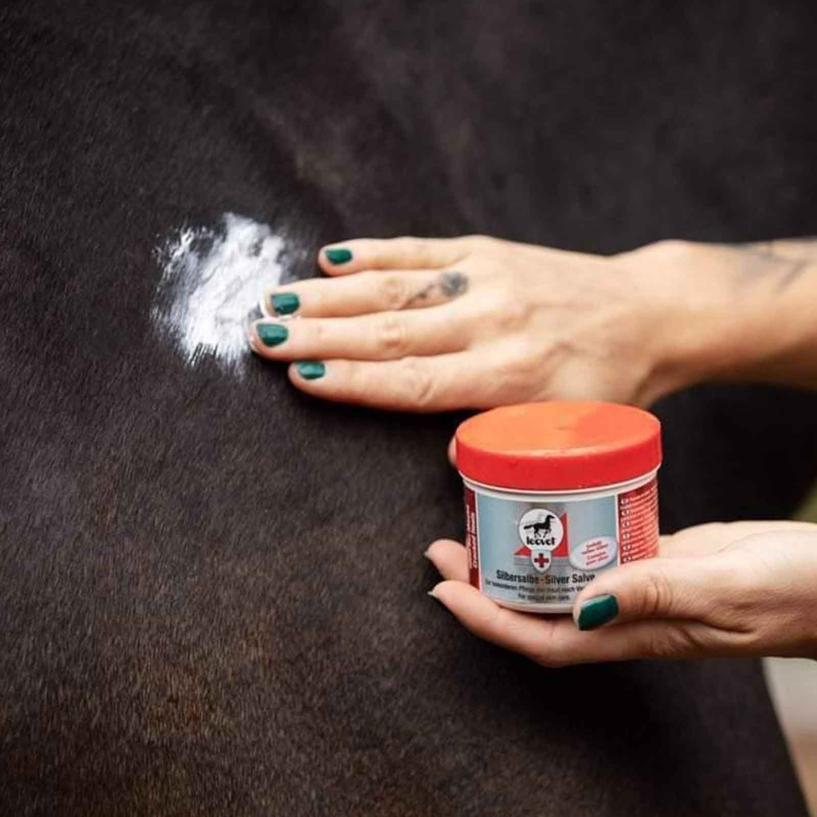 Die Leovet Silbersalbe enthält reines Silber, das ständig Silberionen und somit ihre antiseptische Wirkung freisetzt. Bakterien werden zurückgedrängt, Entzündungen lassen nach und die Haut kann sich regenerieren und beruhigen. Hochwertige Pflanzenöle versorgen rissige Haut mit Feuchtigkeit und machen sie geschmeidig. Auch vorbeugend zum Schutz der Fesseln vor Feuchtigkeit und Bakterien und bei Mauke ideal anwendbar. Die Leovet Silbersalbe kann gemeinsam mit Zinkoxidspray von leovet angewendet werden.