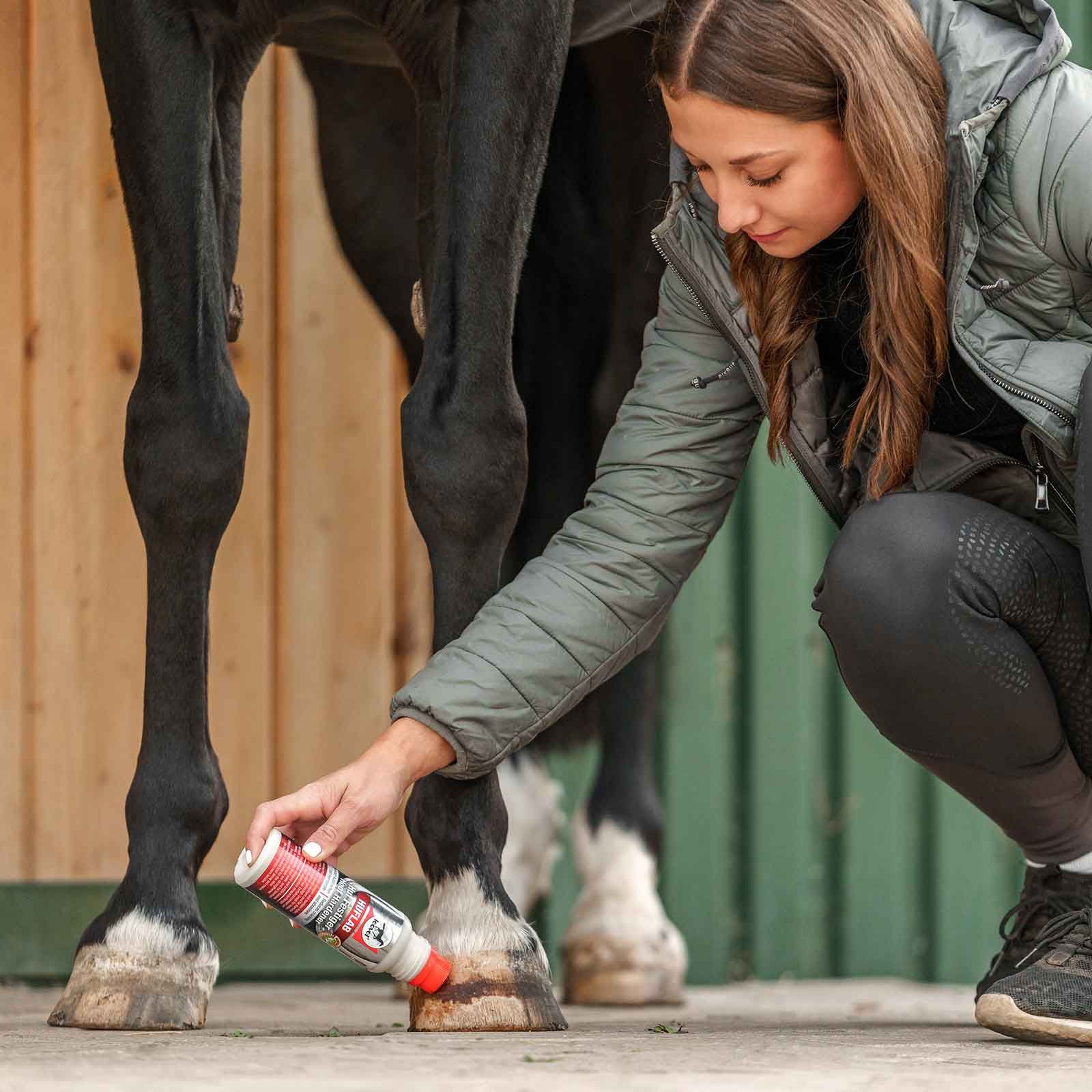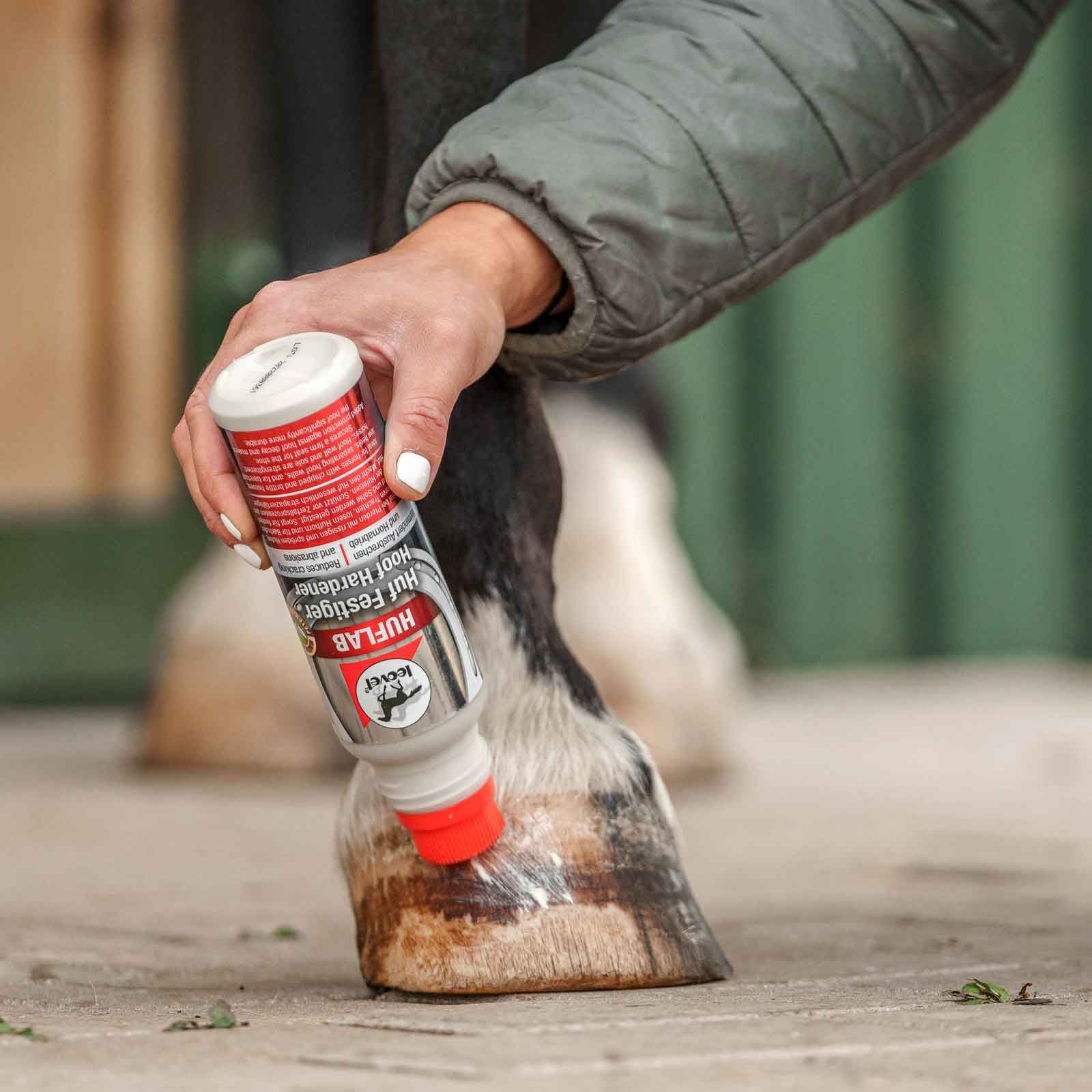 Leovet HUFLAB întăritor de copite este ideal pentru caii cu copite crăpate și fragile. Biotina conținută în produs întărește copita și are un efect pozitiv asupra creșterii coarnelor. De asemenea, întăritorul de copite sprijină eficient regenerarea călcâielor joase și a coarnelor slăbite. În cazul copitelor goale, previne ruperea copitei și uzura cornului. Pentru caii cu potcoave, Leovet Hoof Strengthener asigură o fixare fermă a potcoavei. Ingredientele naturale ulei de nucă de cocos, ulei de semințe de in, castan de cal, tanin din scoarță de stejar și ulei verde întăresc peretele și talpa și protejează împotriva proceselor de degradare a copitei. În general, copita devine mult mai rezistentă.