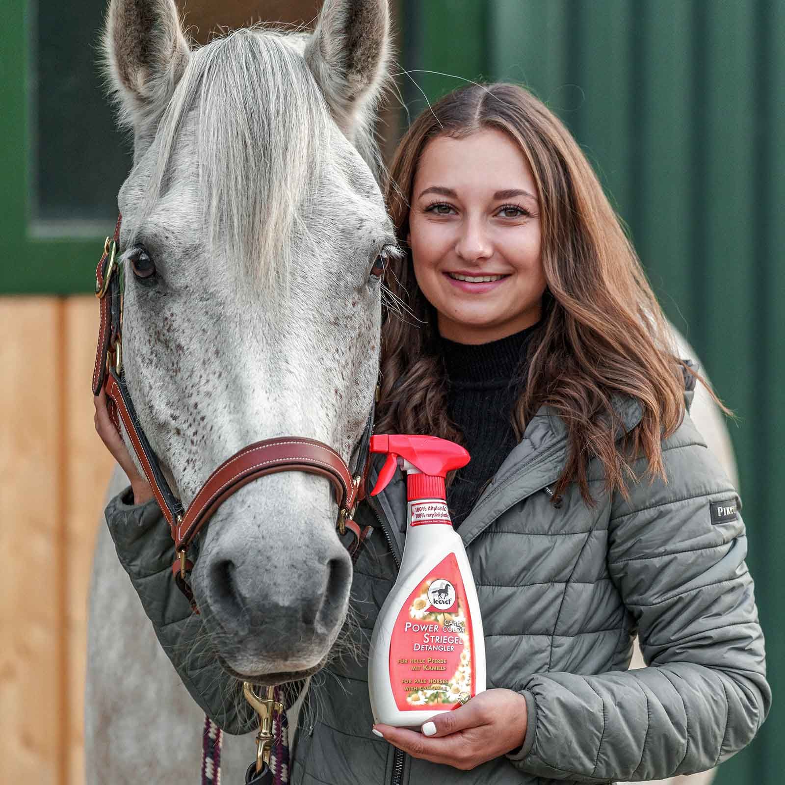 Spray-ul pentru coamă cu mușețel Leovet Power oferă mult volum și asigură pieptănarea rapidă a coamei și a cozii. Mușețelul roman conferă reflexe de culoare strălucitoare blănii deschise. Fluidul de biosulfură inclus contracarează mâncărimile și este cunoscut pentru efectul său pozitiv asupra pielii. Filtrele UV protejează blana, coama și coada de decolorare. Spray-ul Power Striegel Mane are un efect suplimentar de lumină împotriva muștelor și insectelor.