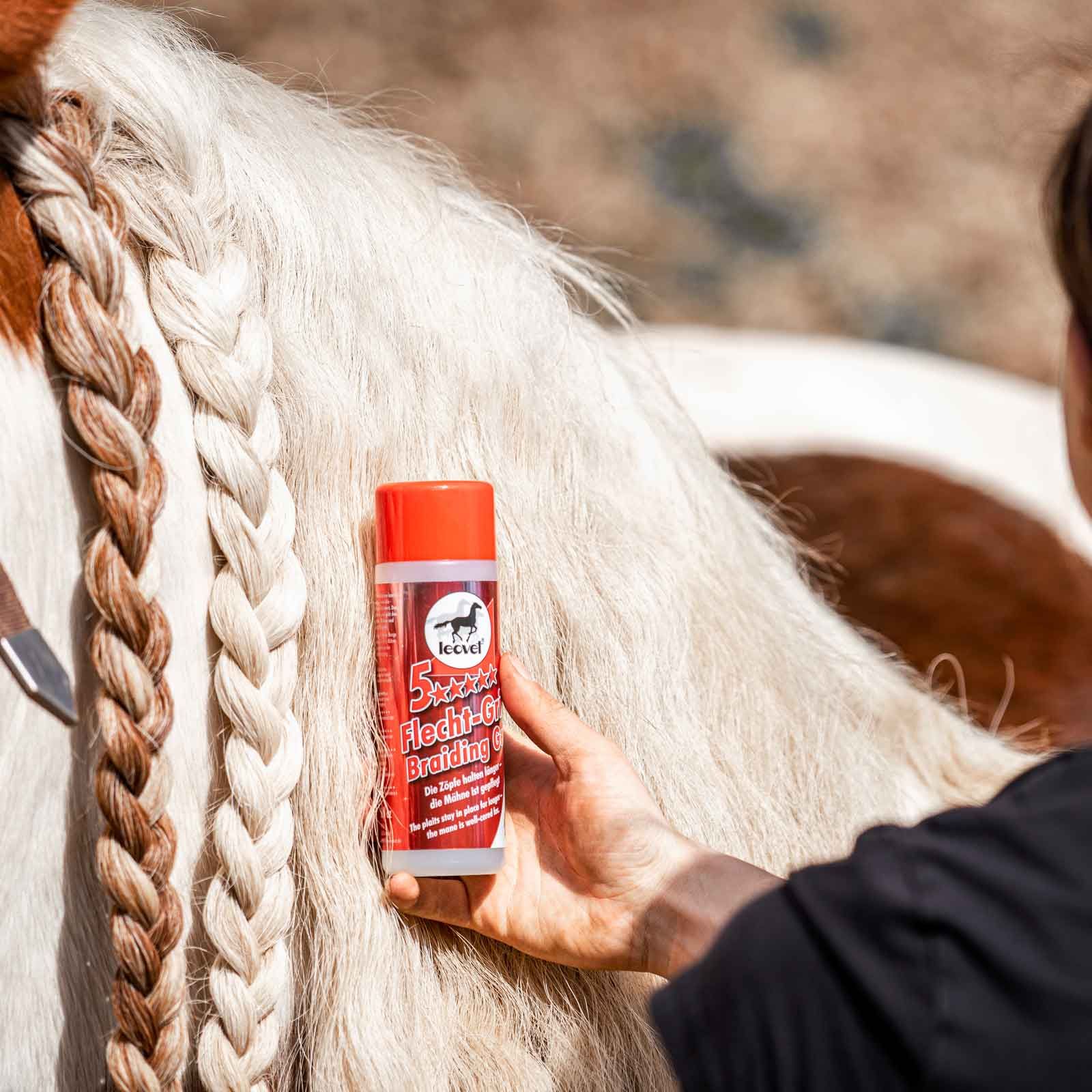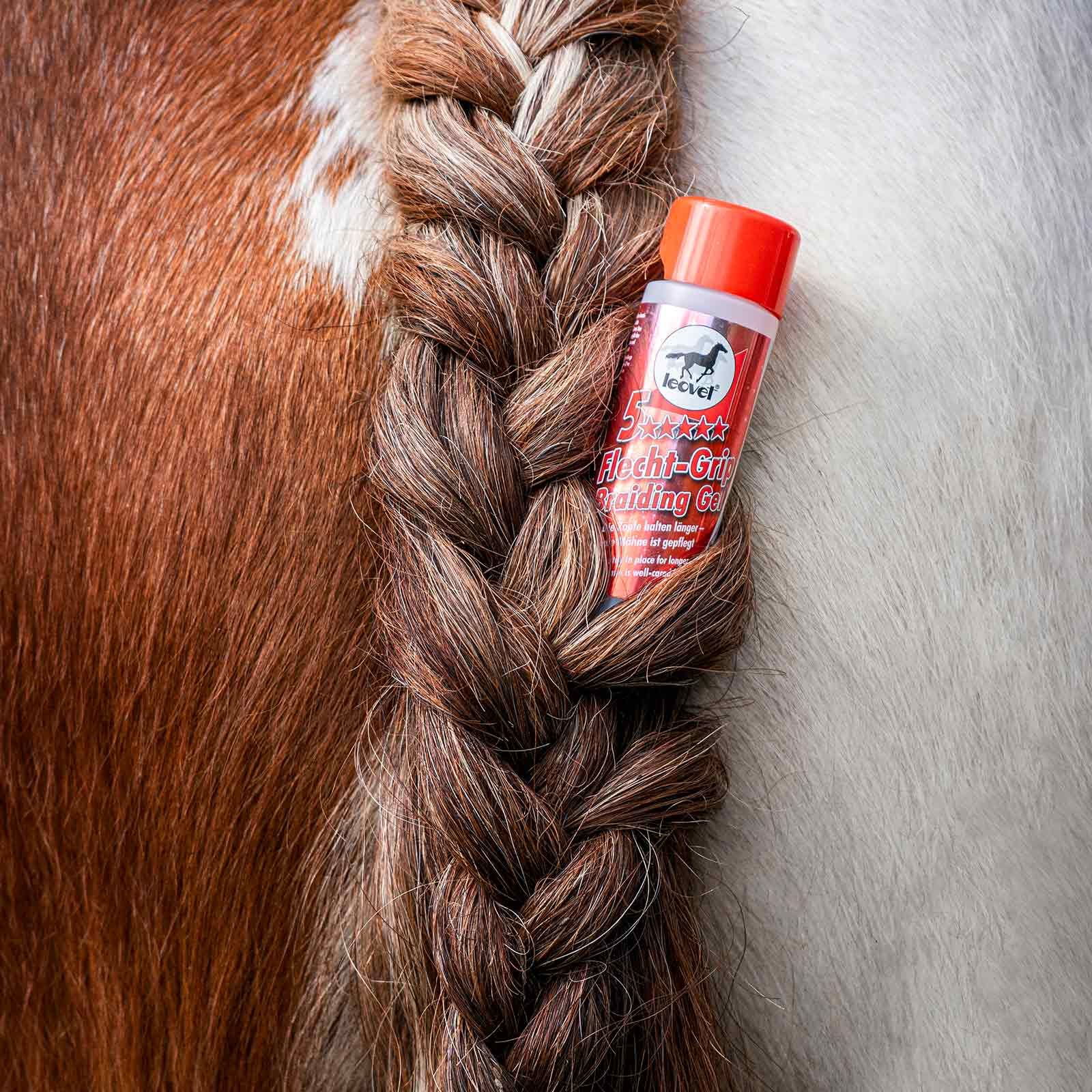 Cu dispozitivul de prindere pentru împletituri 5-Star Braiding Grip, special conceput pentru coamă, împletirea coamei și a cozii este mai ușoară. Gelul Braiding Grip descurcă, îngrijește coama și oferă aderența necesară pentru împletituri în codițe de spectacol. Datorită aderenței optime, împletiturile durează mai mult și se evită destrămarea neatractivă. Deja facilitează separarea firelor individuale și le fixează în împletituri perfecte pentru o perioadă lungă de timp. Leovet 5-Star Braid Grip este, desigur, fără silicon.