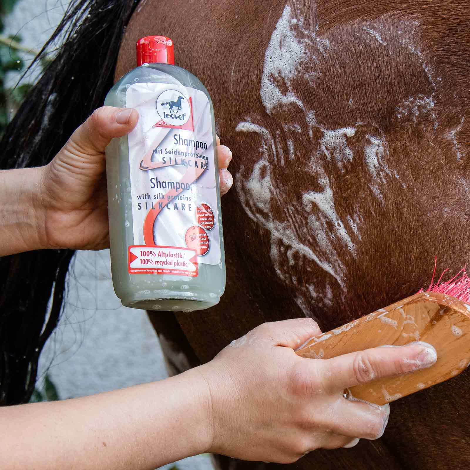 Șamponul Leovet Silkcare pentru cai aduce reflexe ușoare și fascinante pentru blana, coama și coada cailor. Proteinele de mătase de înaltă calitate se combină cu pielea și părul încă din timpul curățării și susțin structura părului. Substanțele vegetale și vitaminele conținute în produs asigură o îngrijire de durată pentru blană și părul lung. Aminoacizii de mătase oferă strălucire și suplețe și țin la distanță praful și murdăria timp de mai multe zile. Protecția împotriva prafului face ca șamponul pentru cai să fie ideal pentru turnee și spectacole. În plus, șamponul Leovet Silkcare nu conține substanțe dopante și poate fi utilizat în competiții.