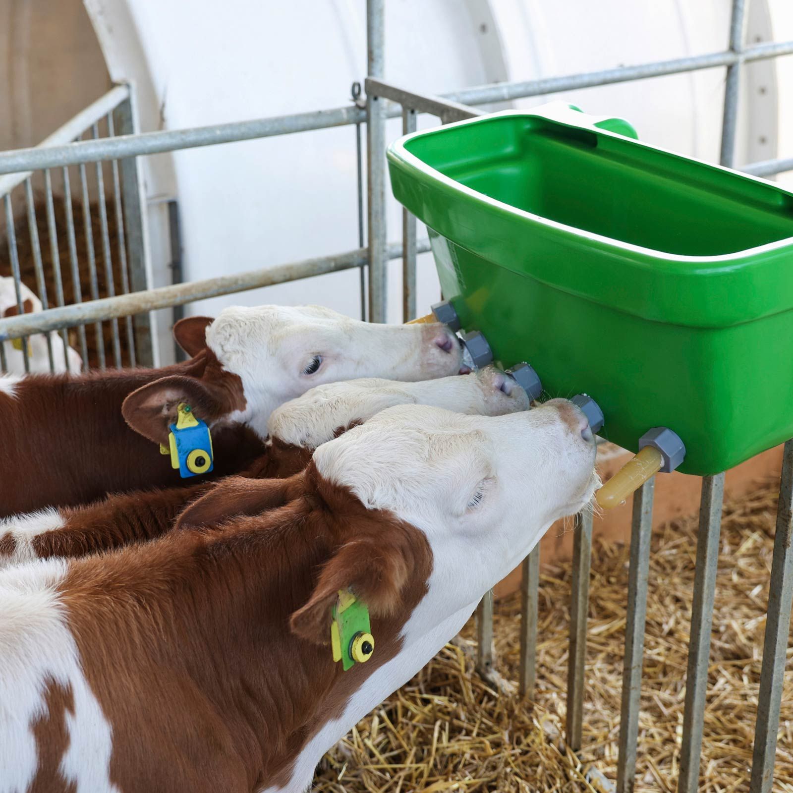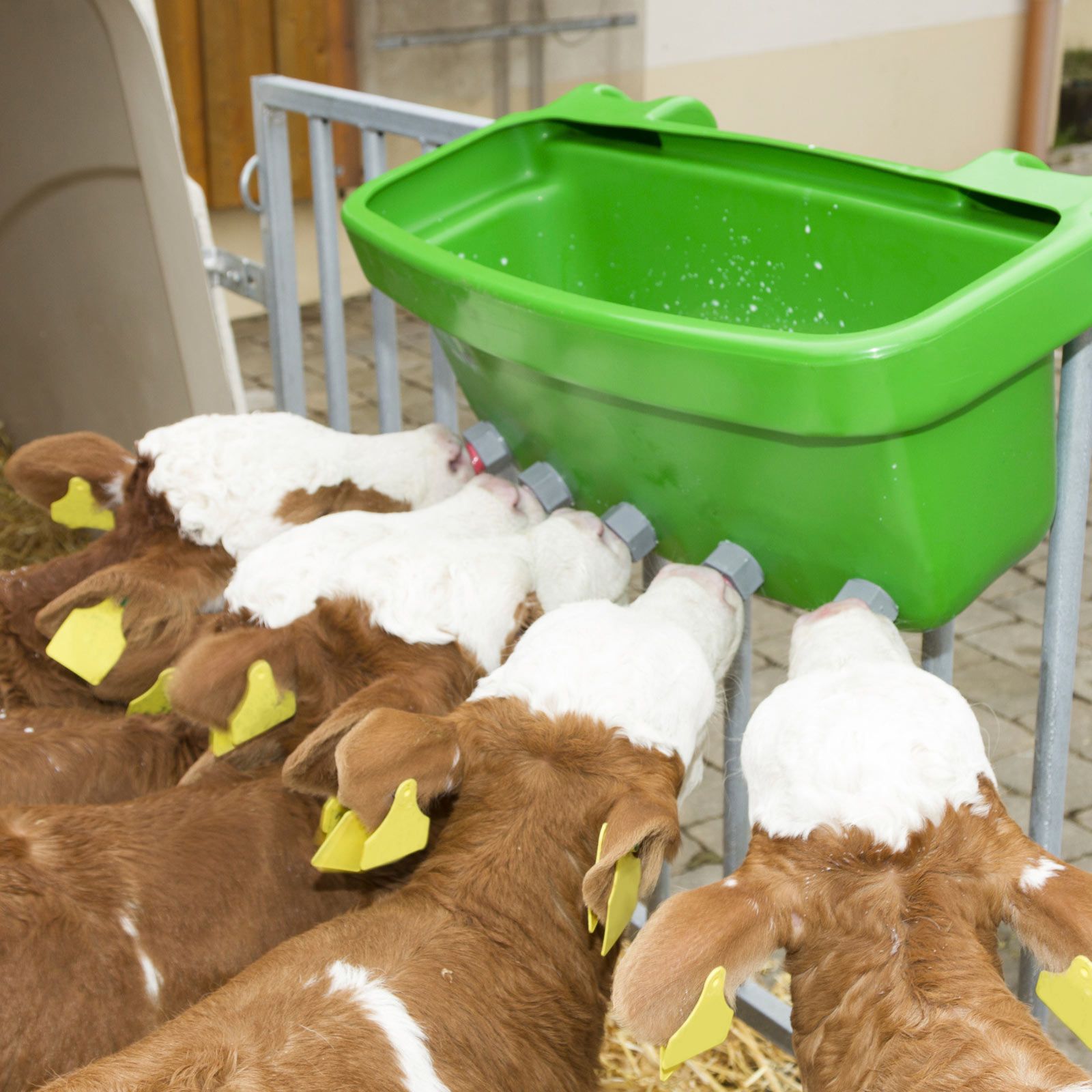Cele 5 bucăți de tetine din latex cu supape cu șurub sunt ideale pentru a-i învăța pe vițeii tineri să folosească găleata de hrănire a vițeilor atunci când se folosește lapte acidulat (hrănire la rece). Cu o închidere ușor de manevrat de tip "turn-and-snap", alimentatorul este fixat ferm pe pereții grajdurilor, pe gardurile de furaje, pe garduri și pe țevi până la un ø maxim de 61 mm (2"). Colțurile rotunjite facilitează curățarea. Alimentatorul pentru viței este stivuibil și poate fi transportat cu ușurință.