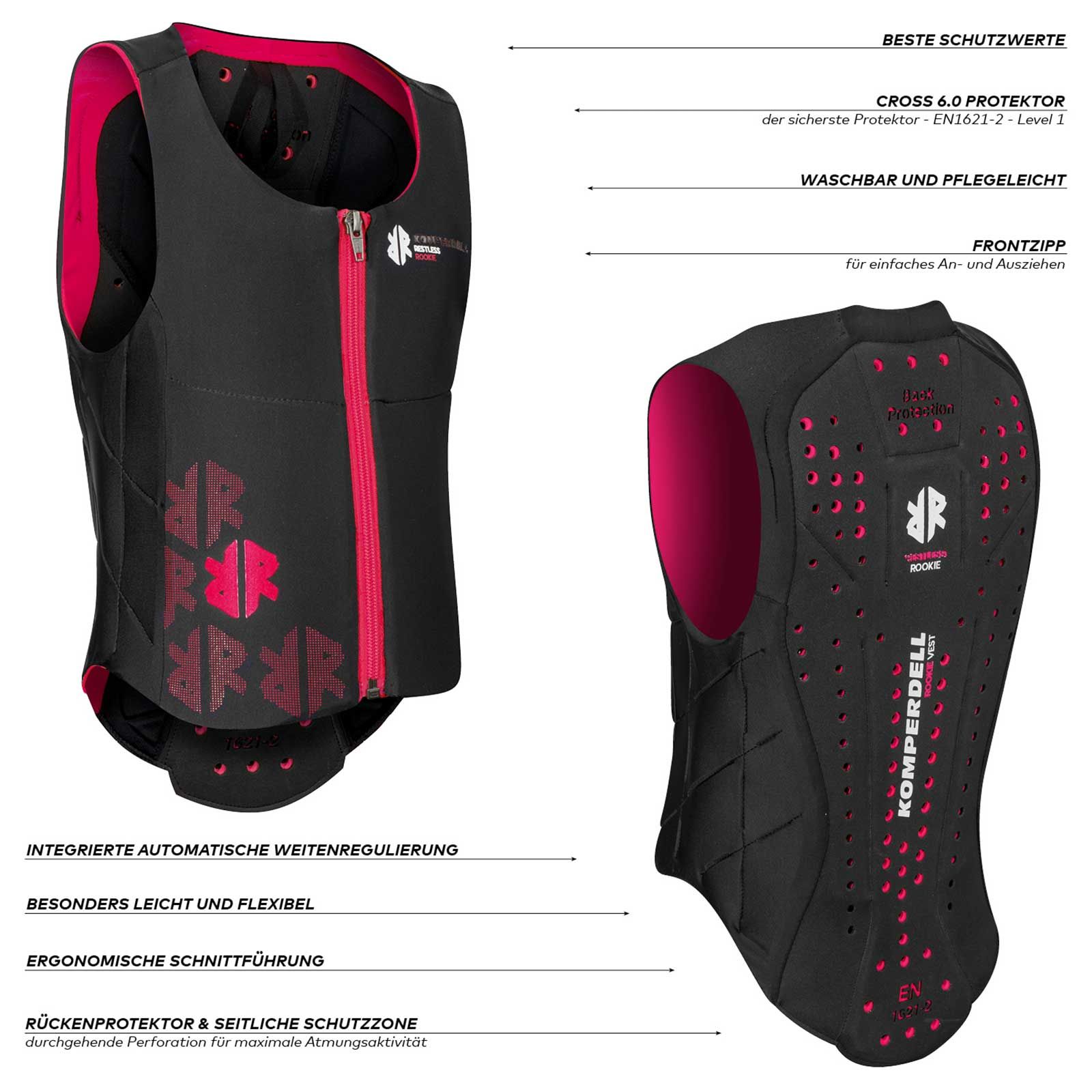 Protecția pentru spate Komperdell pentru copii convinge, printre altele, prin capacitatea sa de multi-impact. Spre deosebire de căștile de călărie, protecția spatelui nu trebuie să fie îndepărtată după fiecare impact. Protecția de spate pentru copii Komperdell Ballistic Vest Junior este fabricată din spumă cu densitate dublă, care se regenerează singură și oferă siguranță 100% după fiecare cădere!