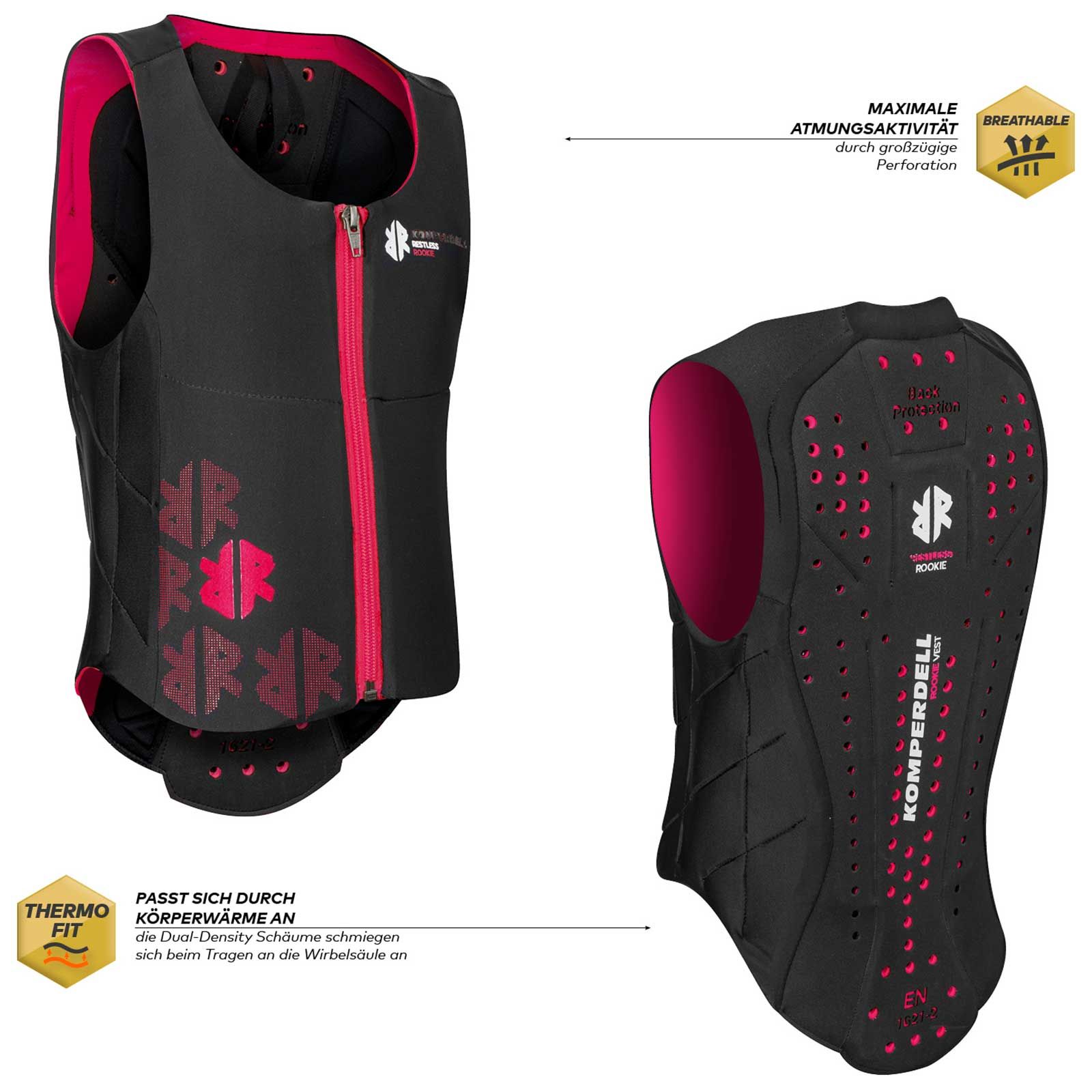 Apărătoarea de spate testată EN 1621-2 - Nivelul 1 cu protecție cu nervuri oferă o libertate de mișcare optimă și un confort foarte plăcut la purtare datorită construcției ușoare și designului subțire. Vesta de echitație protectoare pentru spate Komperdell pentru copii are, de asemenea, un design excelent pentru fetițele care călăresc. Perforația continuă a zonelor de protecție asigură cea mai bună respirabilitate. Vesta de siguranță pentru călărie Komperdell este echipată cu un fermoar frontal, ceea ce facilitează punerea și scoaterea dispozitivului de protecție.