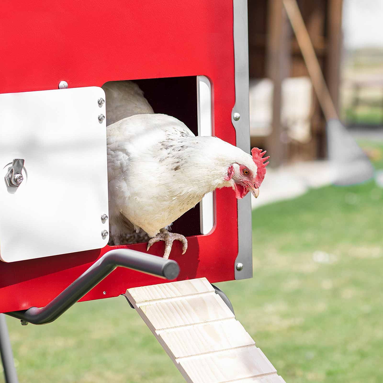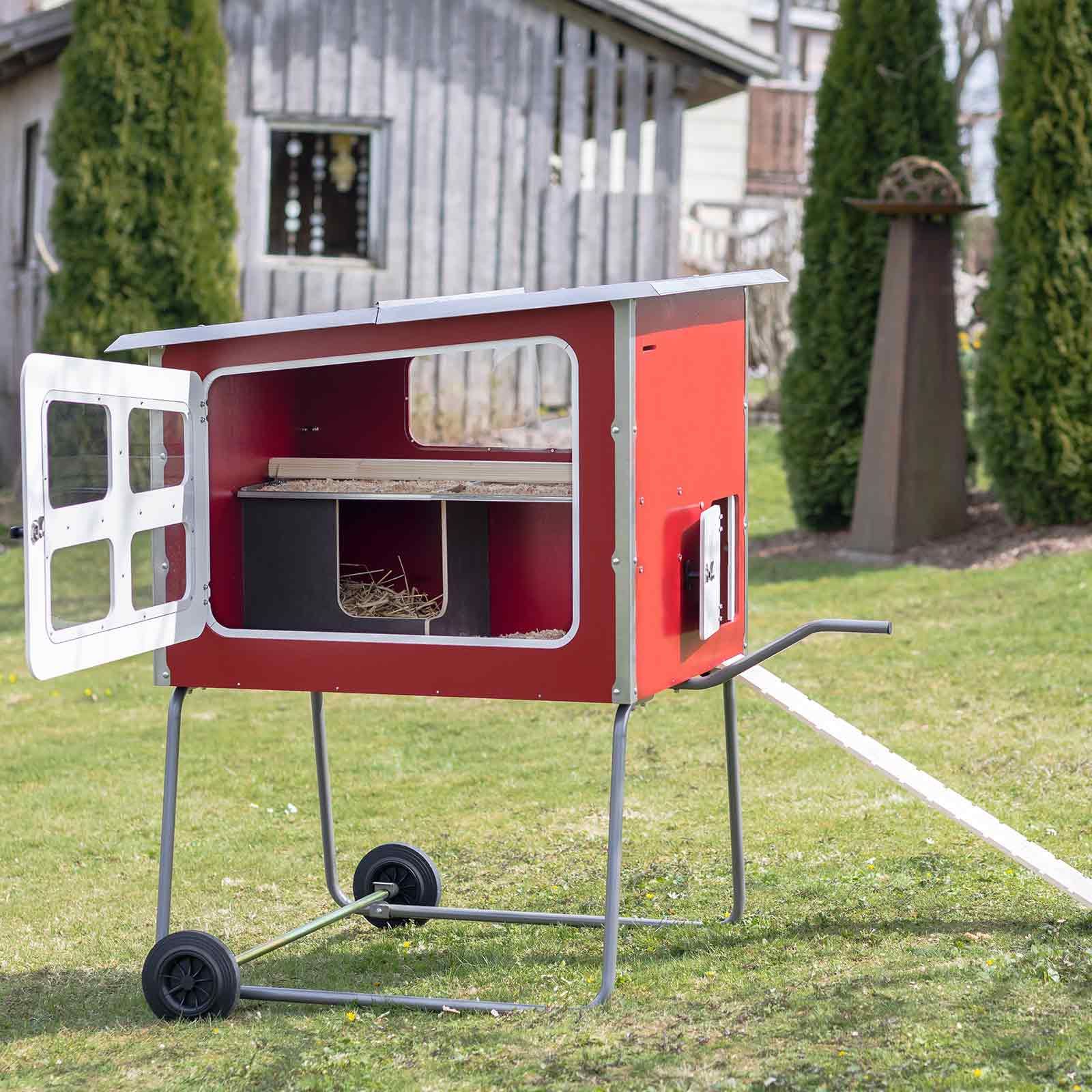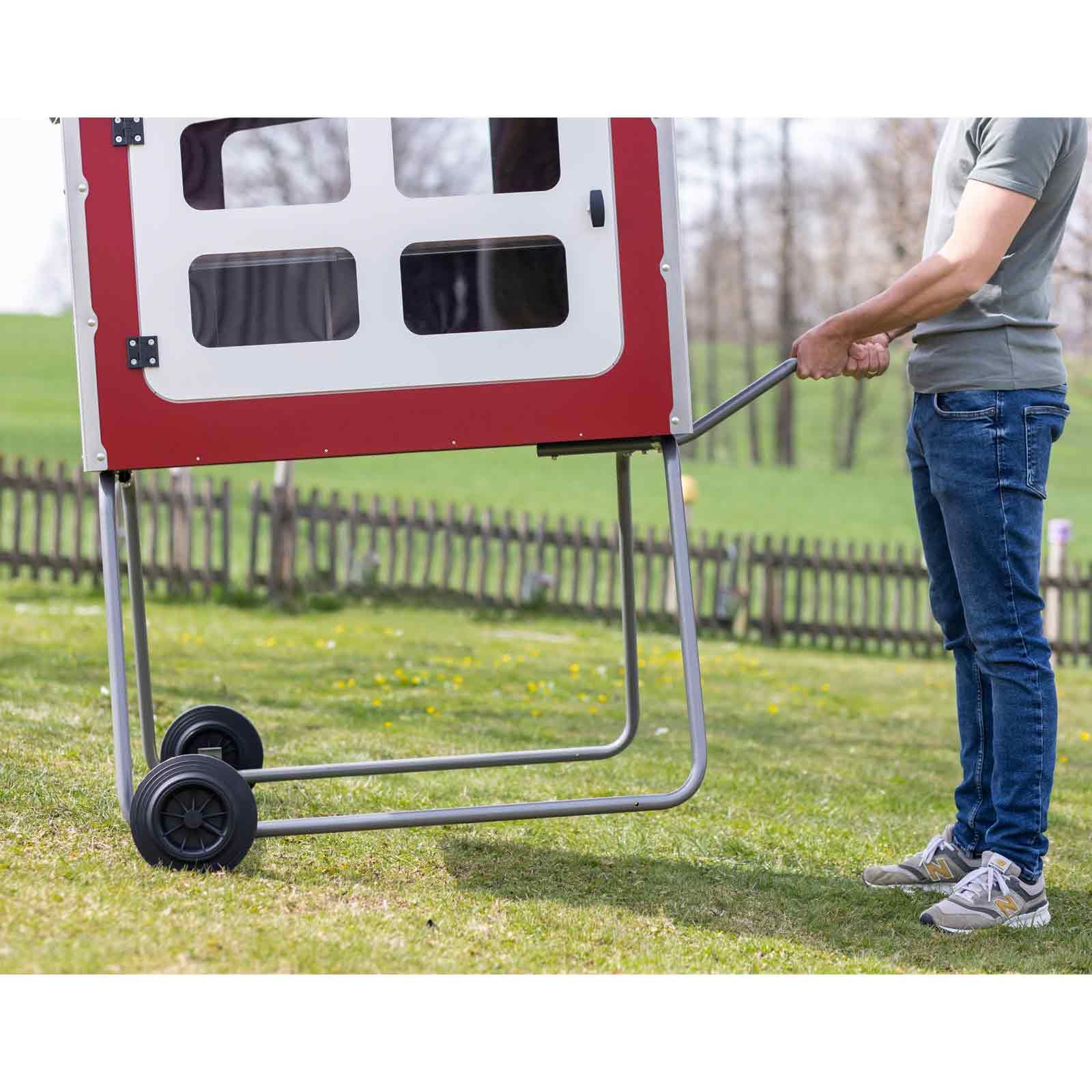 Cotețul Mobile Coop este proiectat pentru utilizare mobilă. Un cadru metalic foarte stabil, cu două roți și un mâner lateral, facilitează ridicarea și deplasarea cotețului pentru păsări. Cotețul mobil "Made in Germany" este echipat cu un acoperiș din oțel inoxidabil de înaltă calitate. Datorită construcției sale foarte robuste și inovatoare, cu șuruburi și fitinguri de înaltă calitate și durabile, este asigurat un adăpost permanent pentru păsările dumneavoastră.