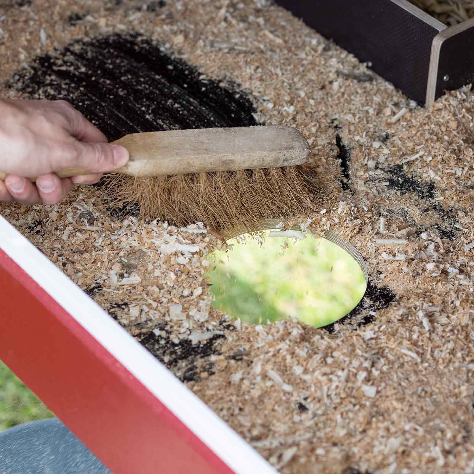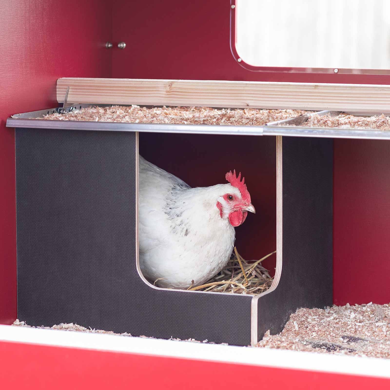 Ușa cu fereastră mare asigură luminozitate în coteț și garantează un ritm zi-noapte sănătos. O încuietoare de ușă sigură protejează împotriva oaspeților nedoriți (de exemplu, martori, vulpi, ratoni). Suprafețele netede îngreunează cuibăritul acarianului roșu de pasăre. În cuibul de ouat întunecat, cu pervazul rotunjit, găinile pot cloci în liniște. Curățarea interiorului este foarte ușoară cu o mătură sau cu un furtun de grădină. Dejecțiile se scurg printr-o deschizătură pe podeaua interioară.