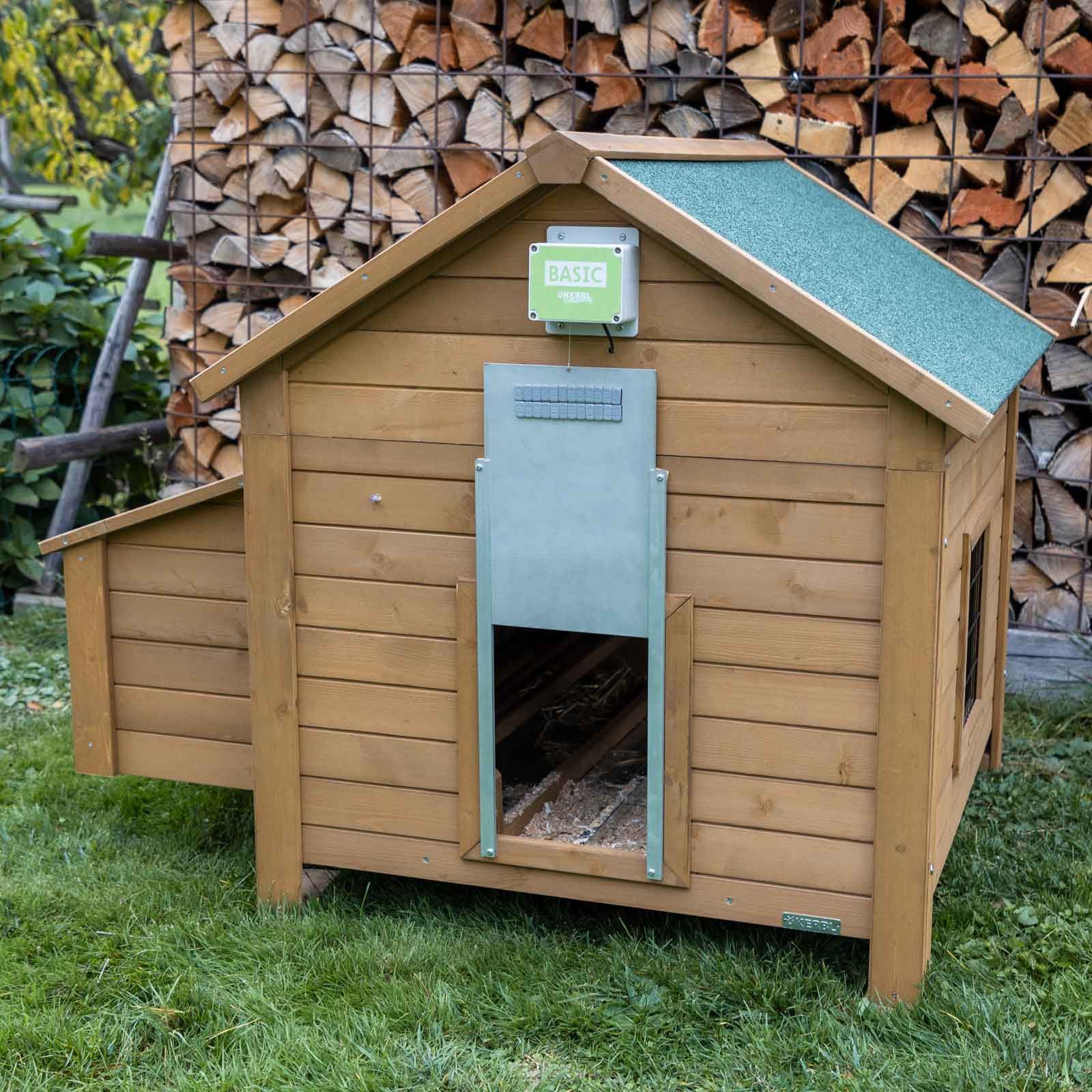 Cu clapeta automată pentru pui Basic, îngrijirea găinilor devine și mai ușoară și mai convenabilă. Datorită controlului dependent de lumina zilei cu senzor de lumină, clapeta pentru pui se deschide și se închide automat, fără ca dumneavoastră să trebuiască să faceți ceva. Senzorul de lumină cu cablu de 1 m lungime permite montarea flexibilă a comenzii în interior.