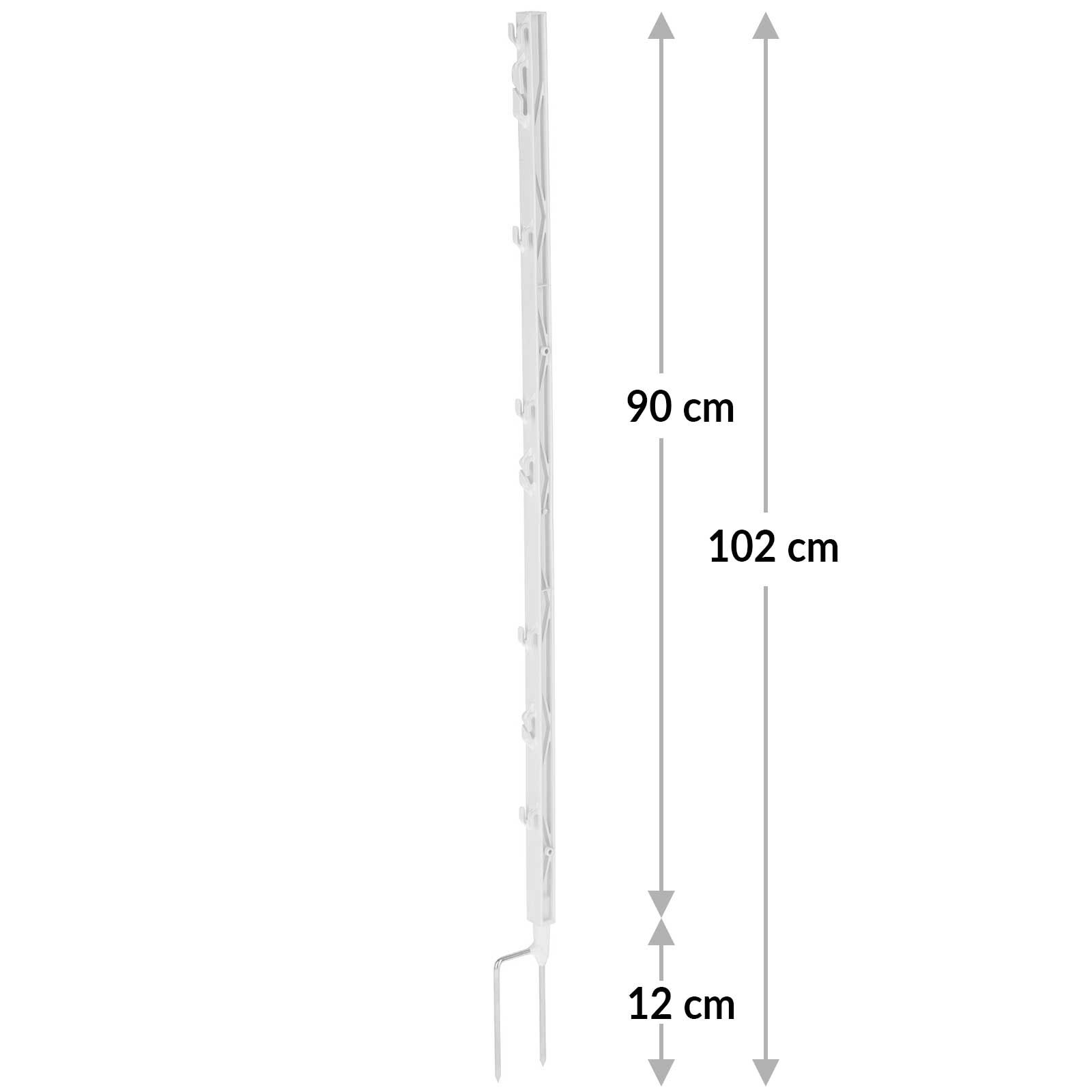 Stâlpul din plastic are o înălțime totală de 102 cm și o lungime deasupra solului de 90 cm. Este potrivit pentru toate benzile, frânghiile, toroanele sau firele obișnuite. Cu cele 5 ochiuri pentru benzi cu o lățime de 1 cm sau frânghii, 2 ochiuri pentru benzi cu o lățime de 2 cm și un ochi pentru panglici cu o lățime de 4 cm, este extrem de flexibil în utilizare.