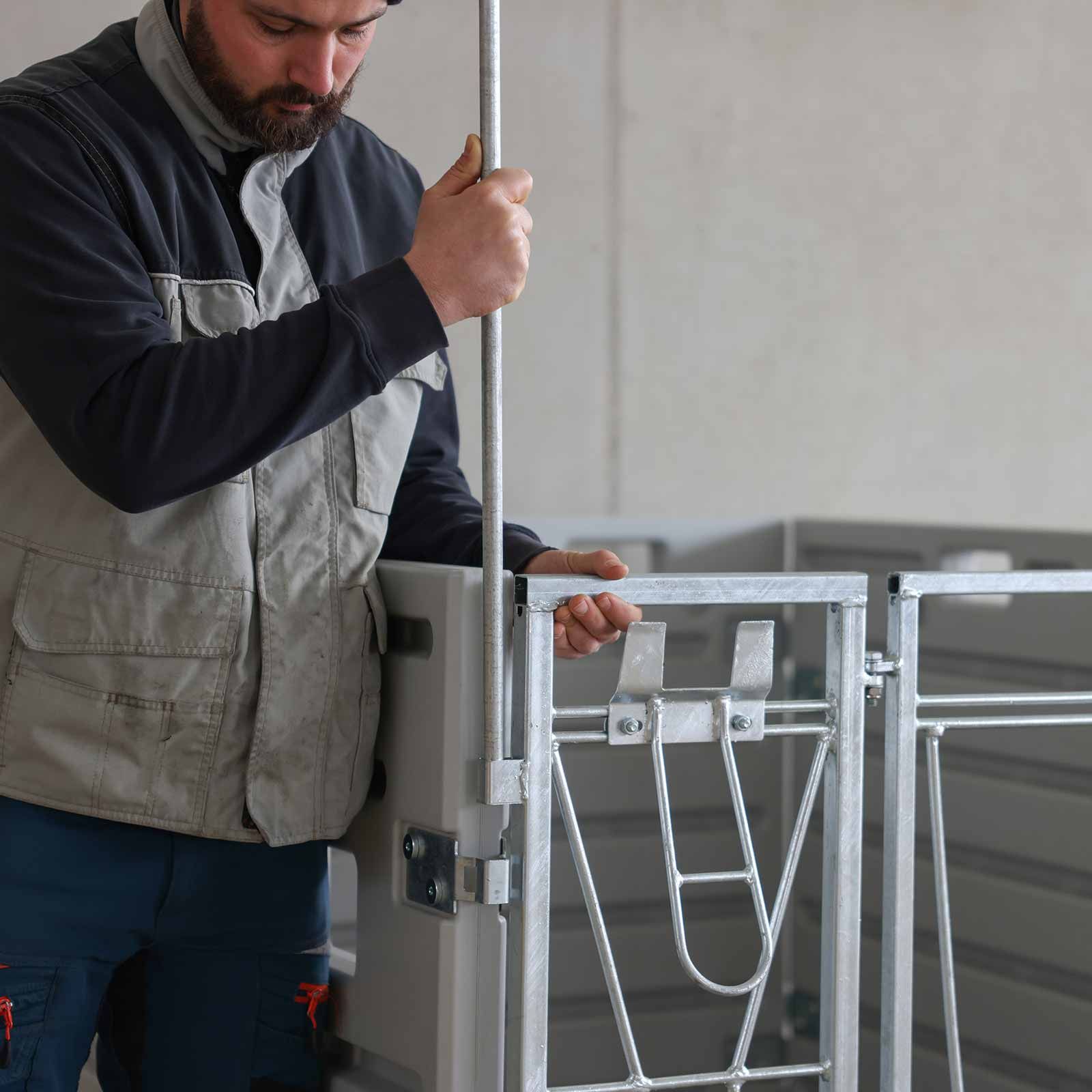 Cutia pentru viței cu un singur țarc poate fi de sine stătătoare și poate fi montată rapid și ușor de către o singură persoană. 3 panouri și elementul frontal pot fi conectate cu ușurință pentru a crea un nou box pentru viței unic. Daca este necesar, cutiile individuale pot fi, de asemenea, conectate pentru adapostirea în grup prin îndepartarea unui panou lateral și conectarea cutiilor cu ajutorul barelor de blocare.