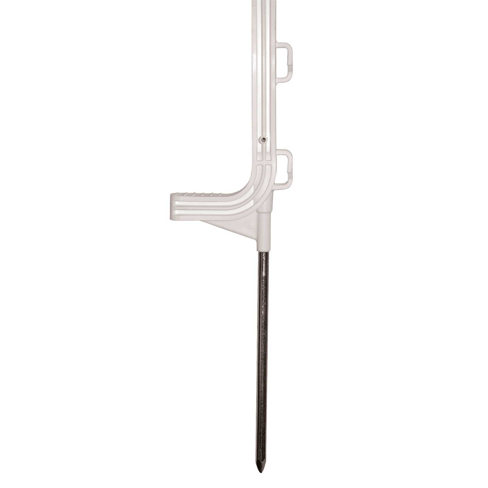 Stâlpul pentru gardul de pășune este echipat cu un cui de sol întărit de 20 cm lungime, care asigură o fixare sigură și stabilă în sol. Lungimea totală a țărușului din plastic este de 107 cm, lungimea deasupra solului fiind de 87 cm. Bara cu o singură treaptă, aproape incasabilă, facilitează introducerea țărușului din plastic, în special în condiții de sol slab.