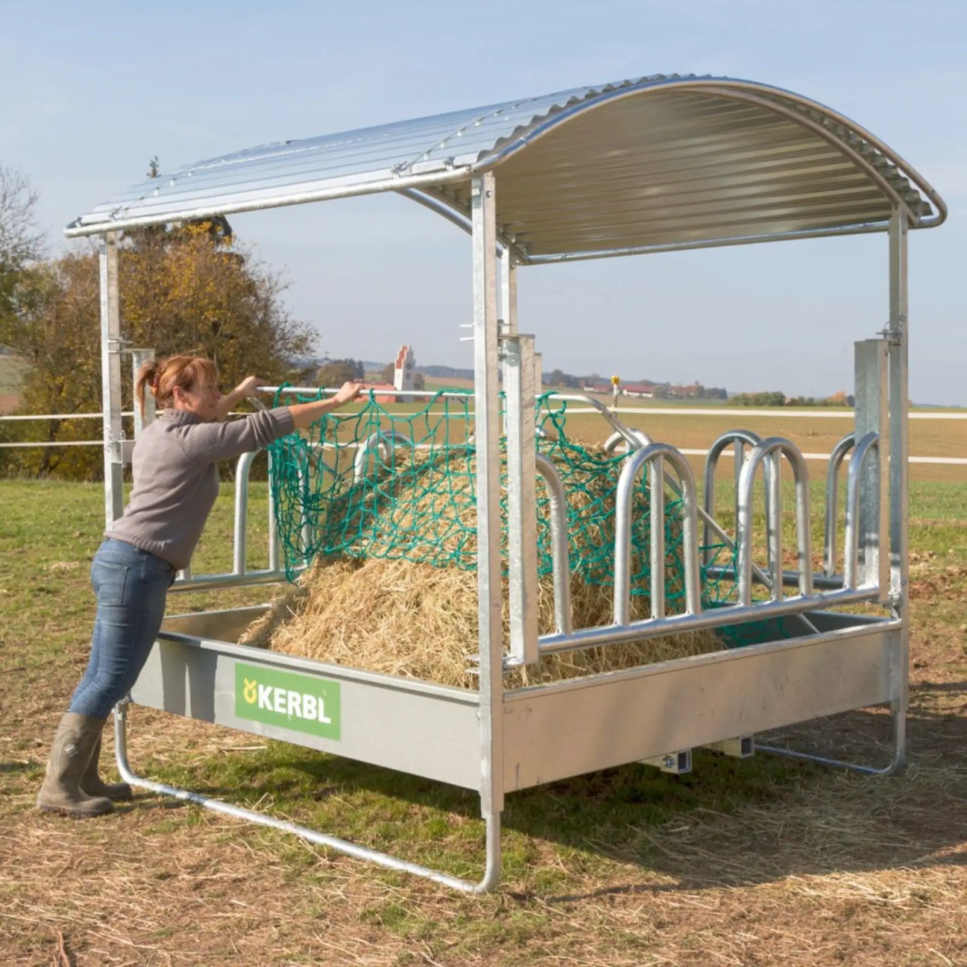 Cadrul galvanizat de înaltă calitate asigură că plasa este întotdeauna bine fixată. Cadrul poate fi deschis și închis cu ușurință, iar plasa nu trebuie strânsă din nou de fiecare dată când este umplută. În plus, cadrul întinde plasa de economisire a furajelor direct peste fân și este potrivit pentru toate suporturile de furaje pătrate.