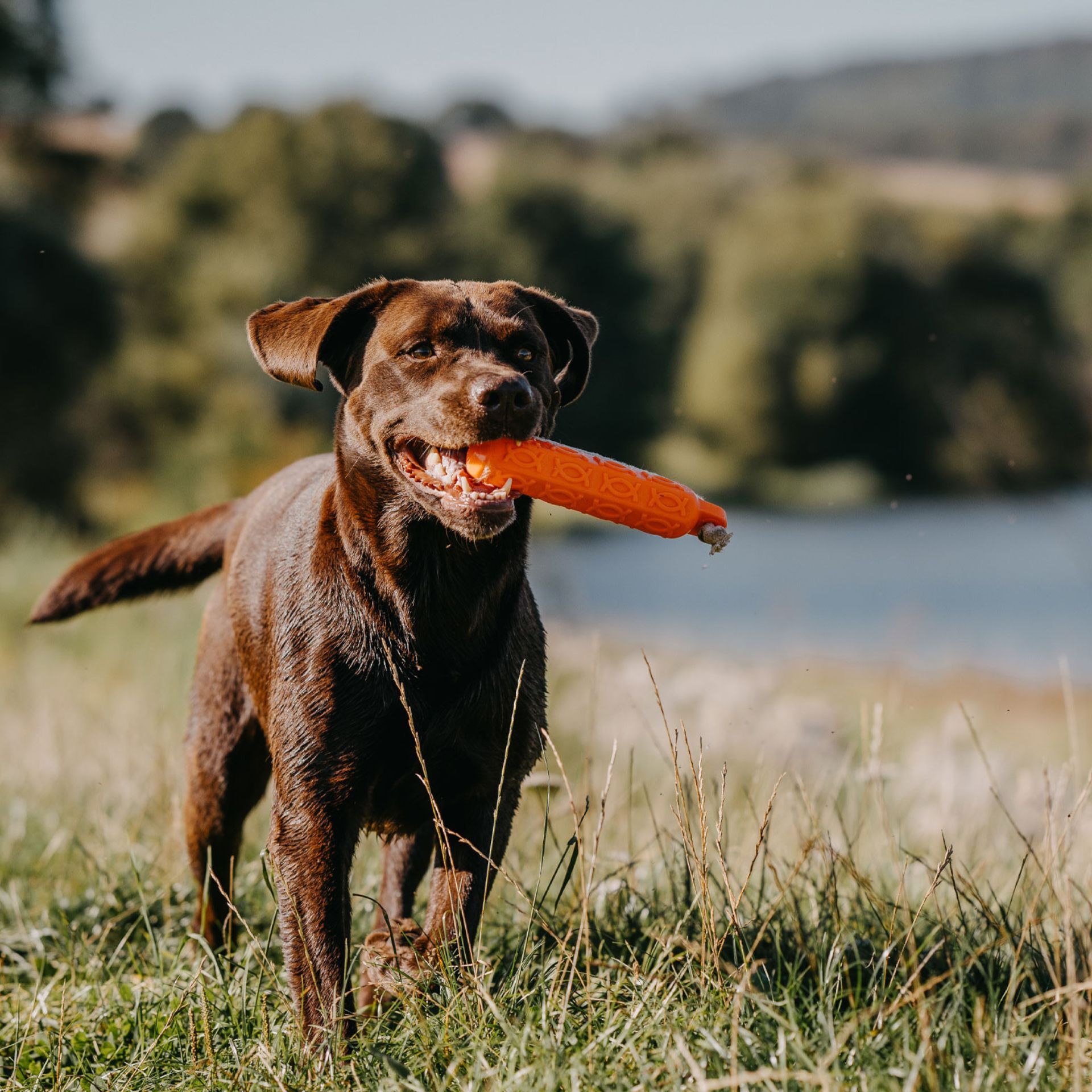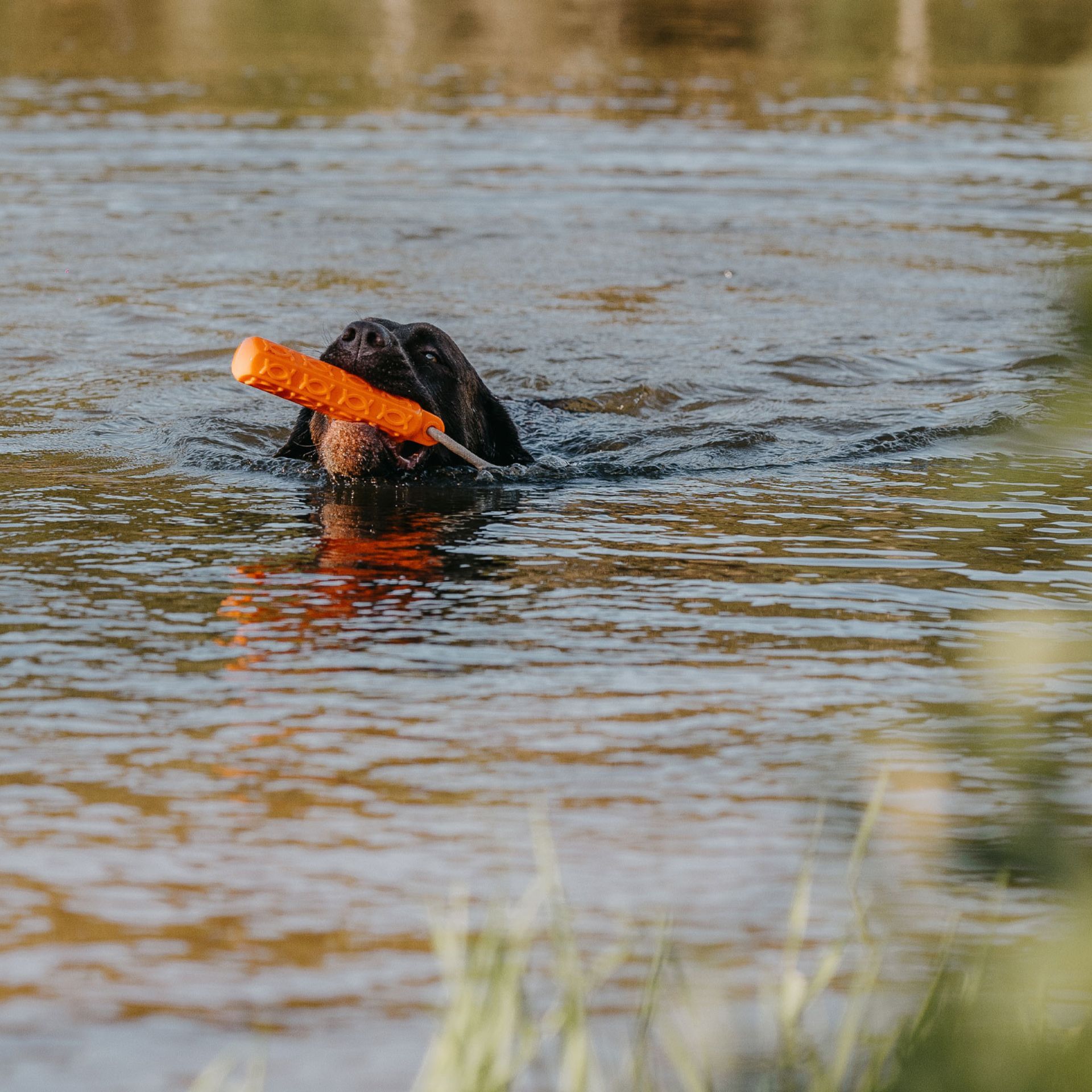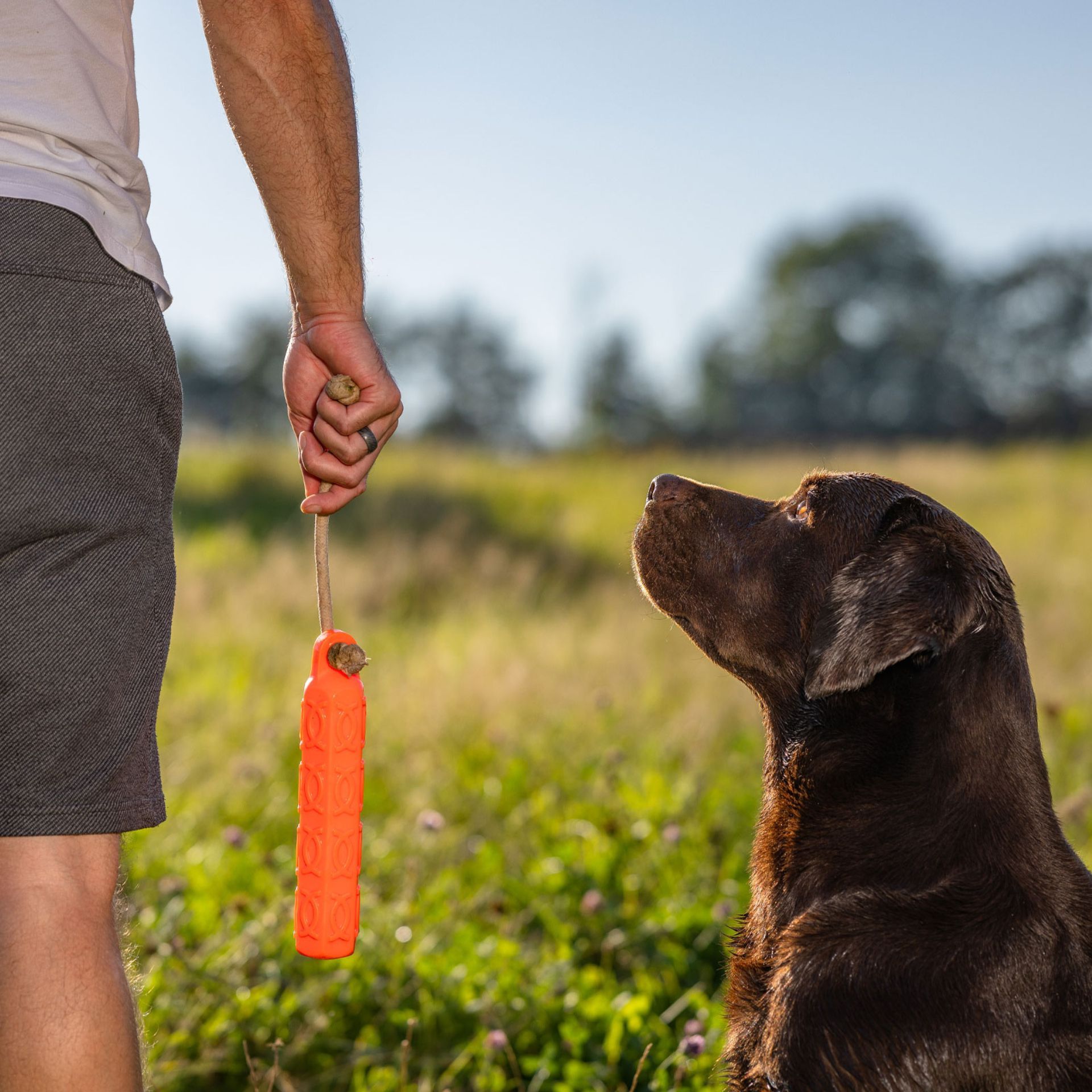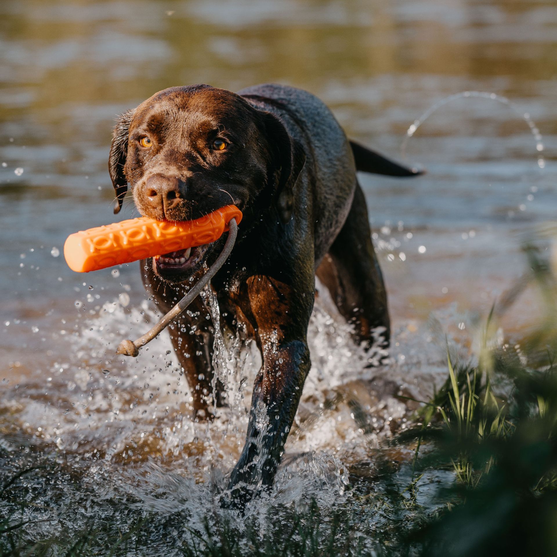 Da, datorită formei hexagonale și a modelului de relief, câinele poate apuca și ține bine manechinul.