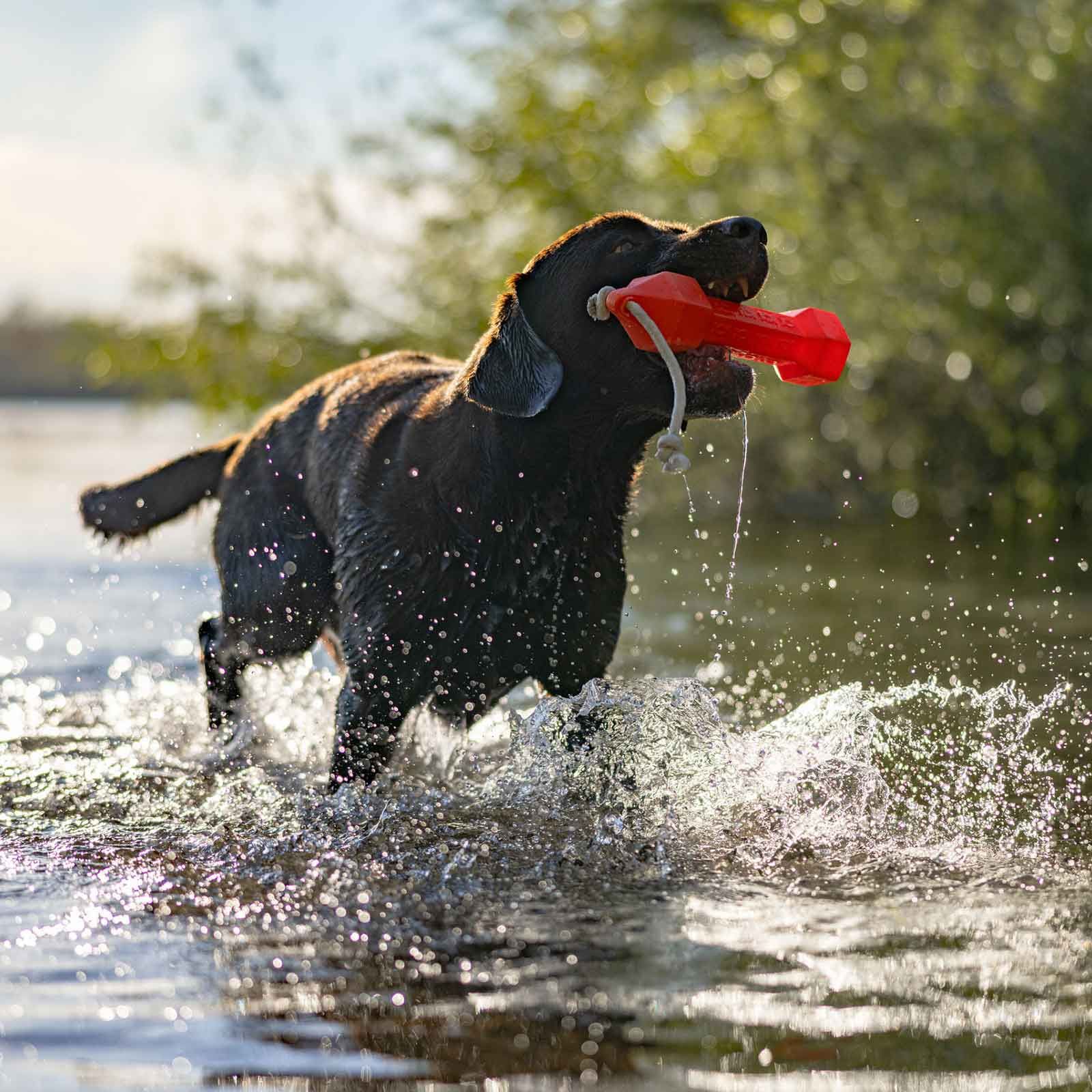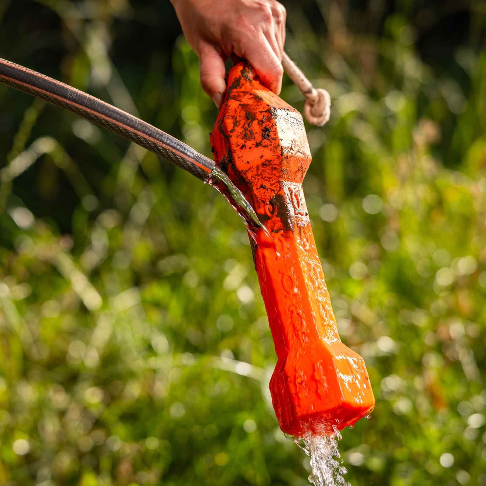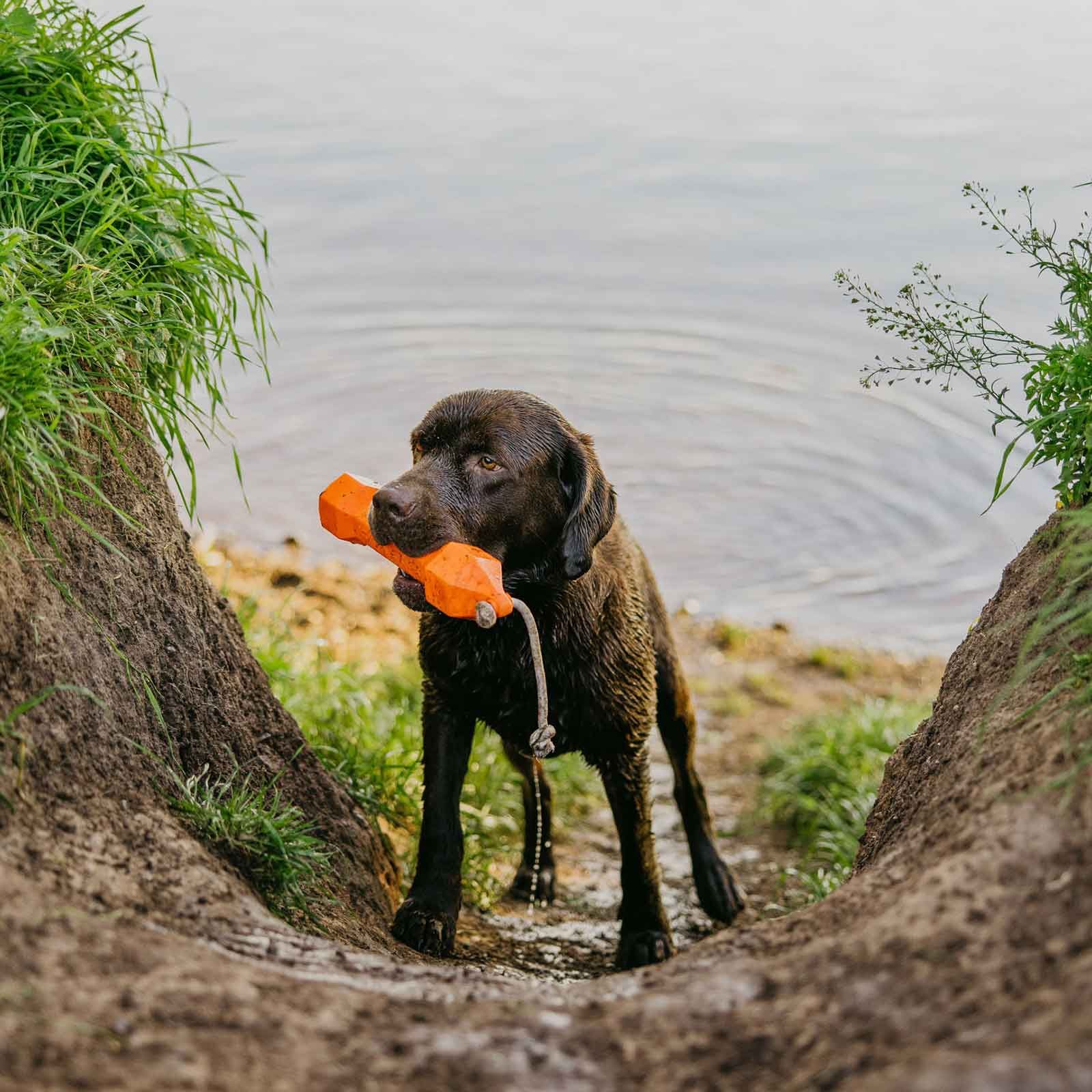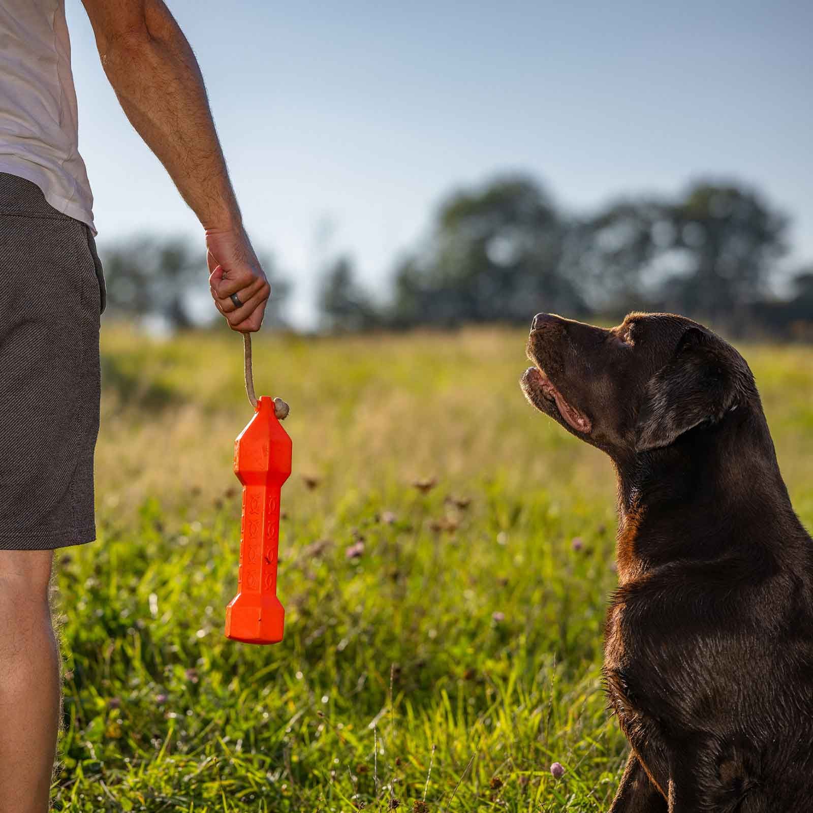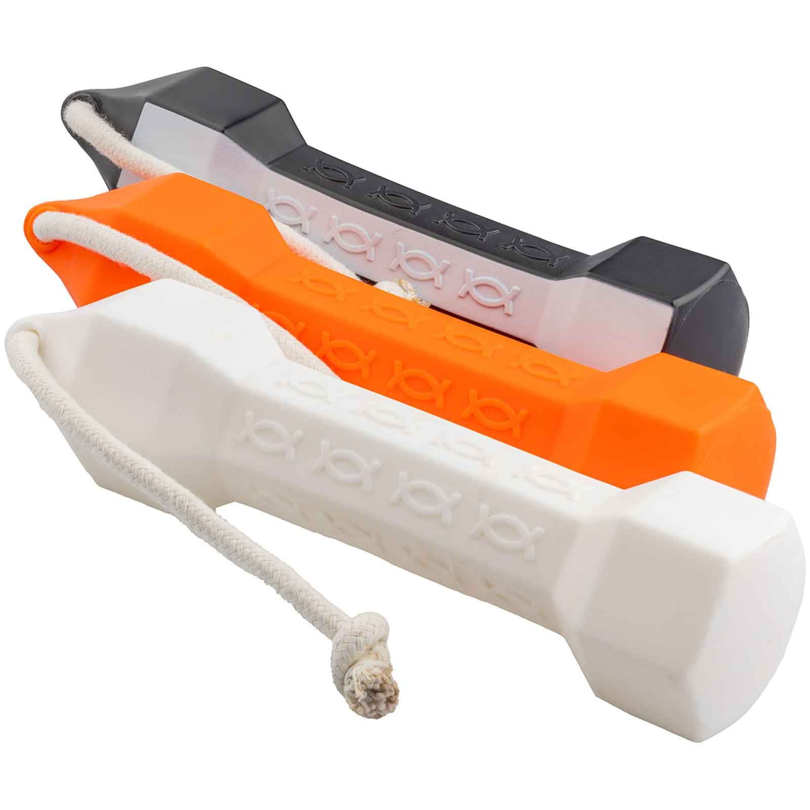 Da, datorită formei hexagonale și a modelului de relief, câinele poate apuca și ține bine manechinul.