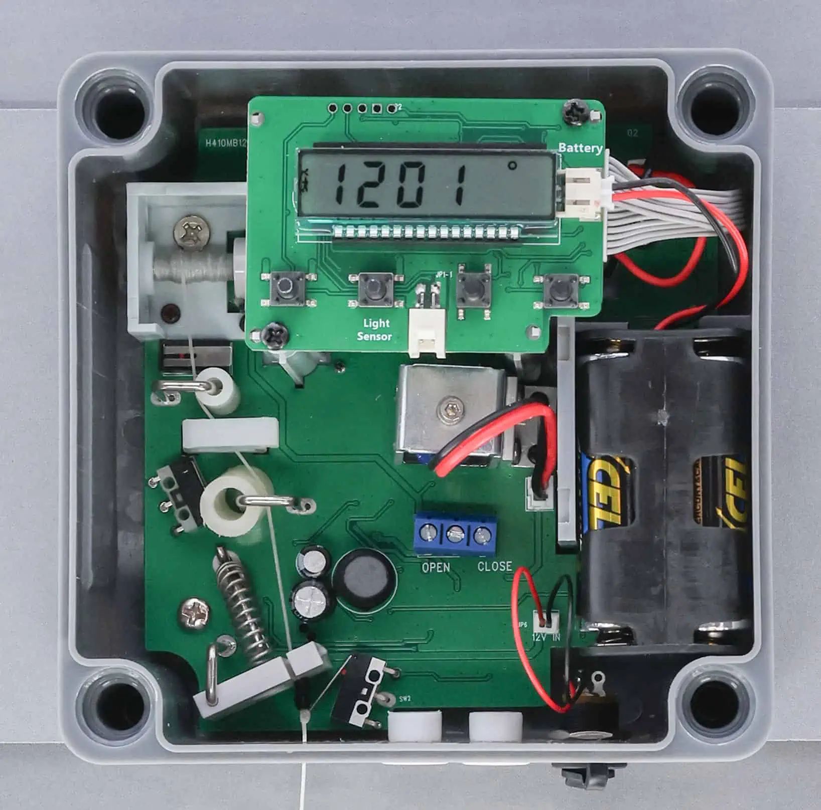 - designul compact permite instalarea pe multe adăposturi mici de păsări< li>Funcționare la rețea sau la baterie de 230 volți (4 x AA Mignon )