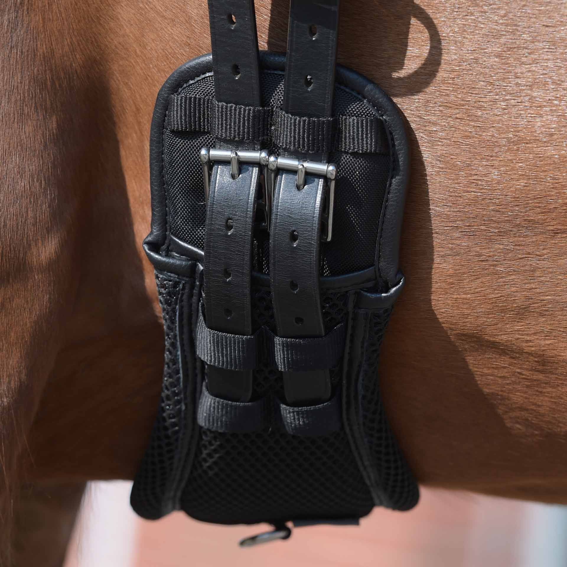 When strapping and re-strapping, make sure that the strap is as loose as possible and only tightened as much as necessary. The correct position of the belt must always be ensured. A flat hand should fit easily between the horse's body and the girth at about elbow height. In addition, the straps of the saddle should ideally be guided vertically downwards from the saddle girth, without pulling forward or backward, and the girth should rest evenly on the breastbone. Check the horse regularly for pressure and rubbing areas.