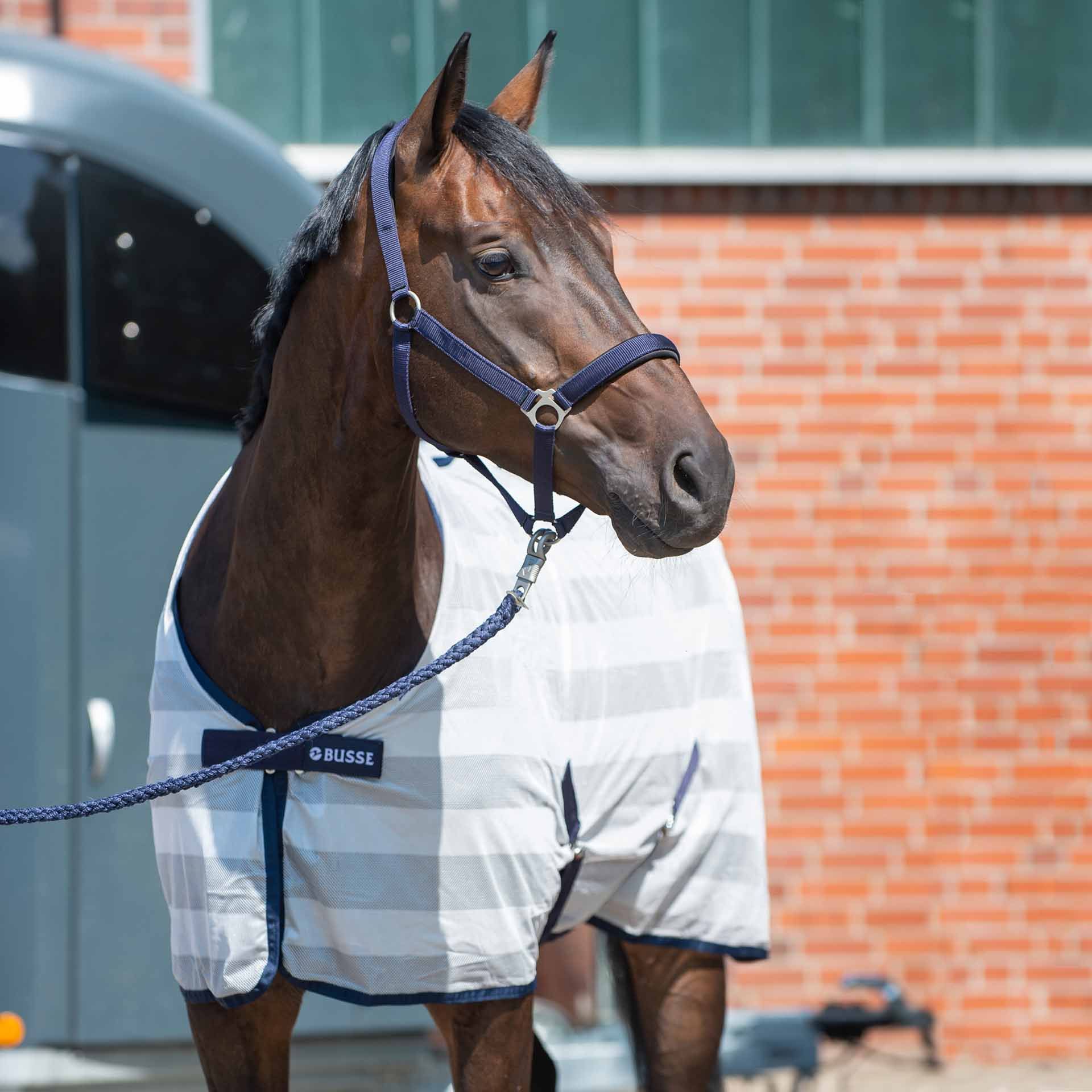 busse busse business Antimosche Acoperiți este accesoriul ideal pentru stabil, transport și multe altele. Această pătură este confecționată dintr -o țesătură de rețea de poliester, un material care respinge murdar și umiditatea, garantând calul tău o protecție optimă.