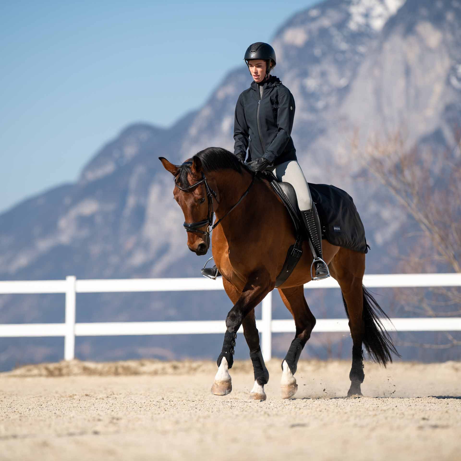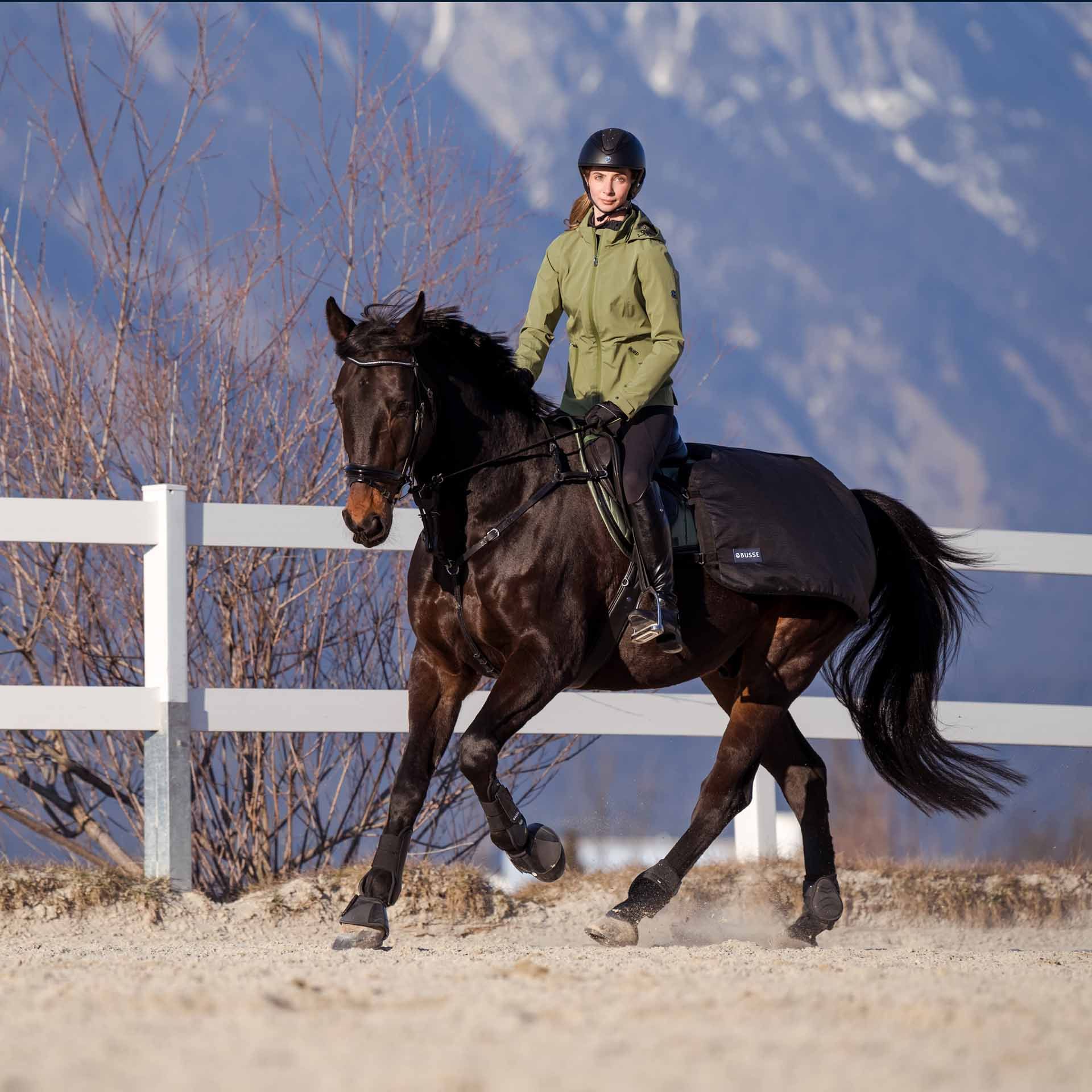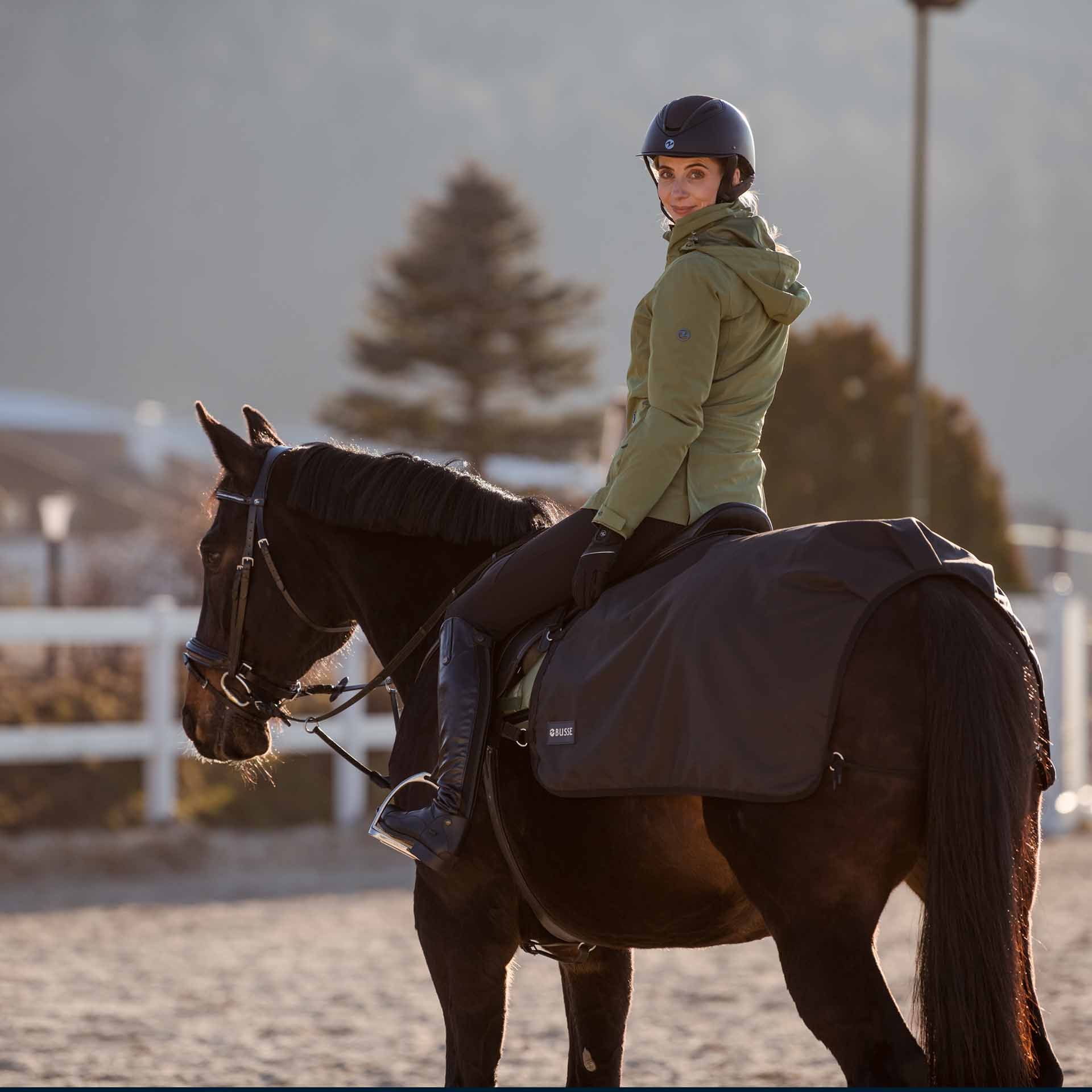 Pătura poate fi fixată rapid și ușor pe șa sau curele de șa sau curele folosind patru curele reglabile cu închidere velcro. Adâncimea laterală redusă permite comunicarea comunicată cu calul în timpul antrenamentului. Un cordon spate și o margine de finisare coordonată a culorii completează caracteristicile acestei pături funcționale și de înaltă calitate. Nu lăsați vremea rea ​​să vă întrerupă antrenamentul - alegeți pătura de antrenament Busse Rain 50.