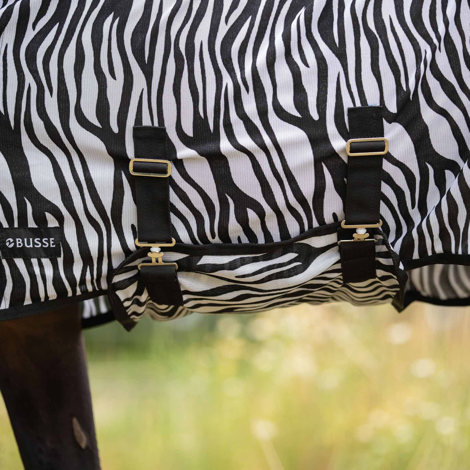 Busse Busse Antimosche Confort Flexi Zebra este soluția optimă pentru a -ți proteja caii de muște și insecte în timpul șederii în stabil, pășune sau în padoc. Desenul cu dungi albe și cu dungi negre zebra oferă un nivel suplimentar de protecție, respingând în mod natural muștele de cal enervante: conform studiilor recente, caii cu acest model nu sunt recunoscuți ca țintă de către paraziți.