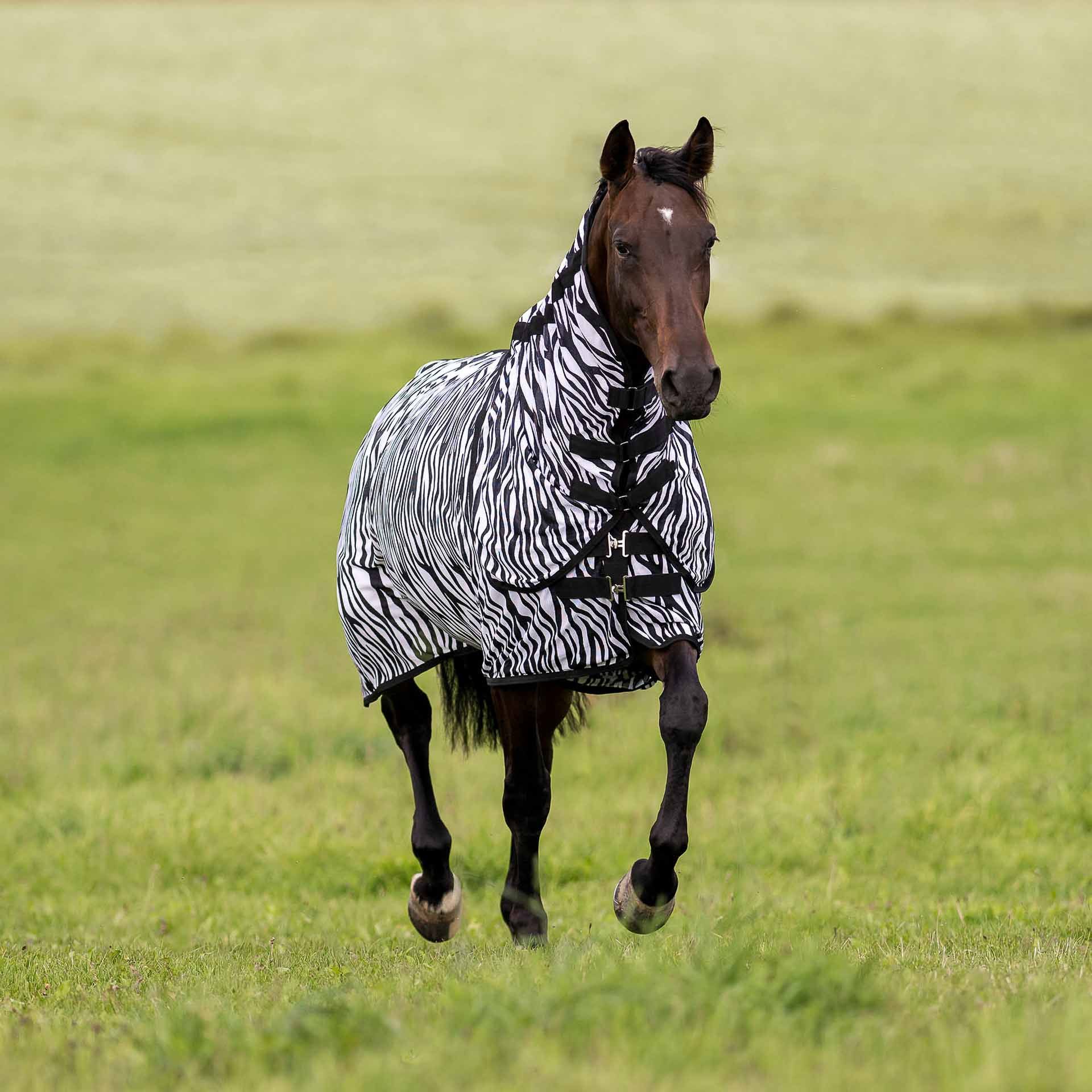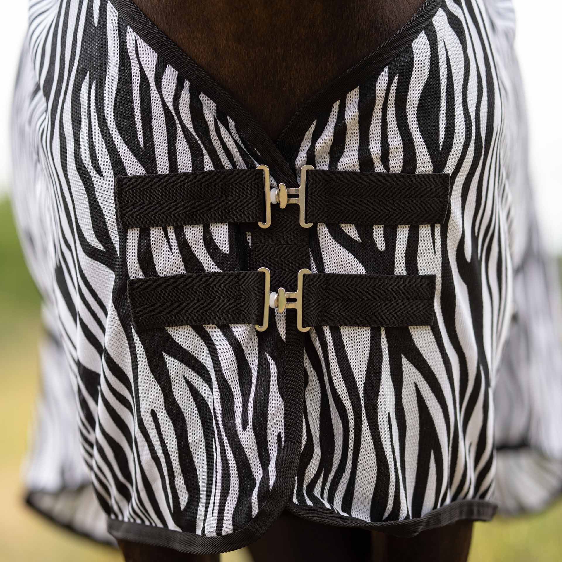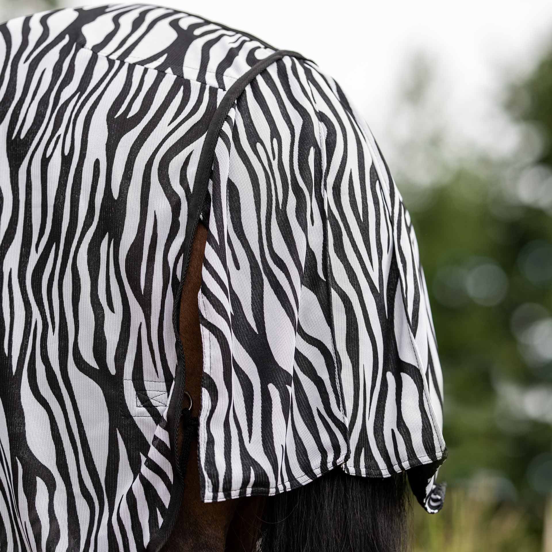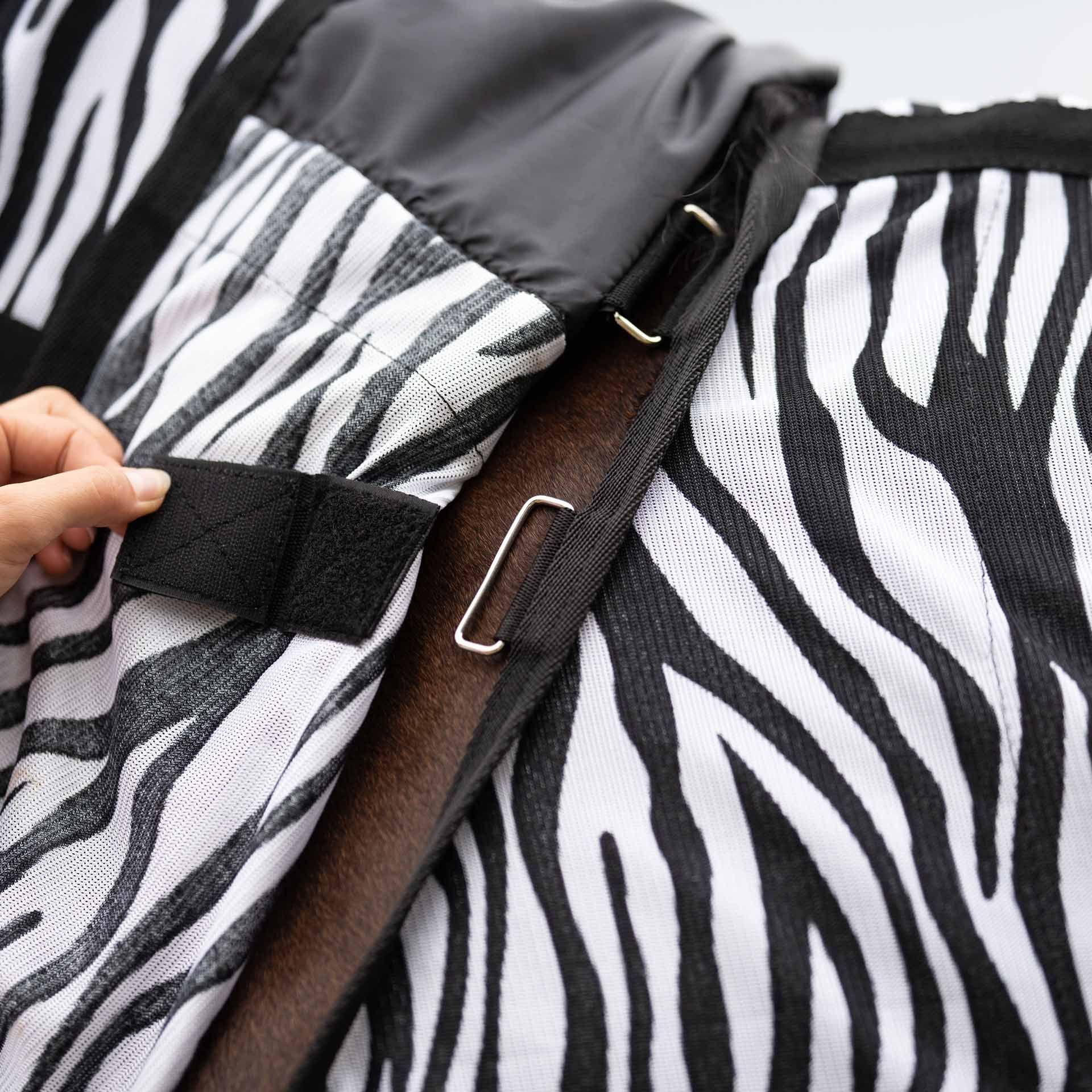 Partea gâtului este detașabilă și se aplică cu închideri confortabile de velcro, în timp ce burta este protejată de un panou anastic, elastic și reglabil în lungime. Înfundarea dublă de pe piept, cu velcro integrată, asigură o etanșare perfectă a păturii, iar acoperirea în formă anatomică pentru coadă oferă o protecție suplimentară. Centura din spate adâncă garantează o reglare excelentă de reglare. Cu o pătură anti -animală confort Flexi Zebra, calul tău se va putea bucura de toată libertatea în aer liber, fără a fi deranjat de muște și insecte.