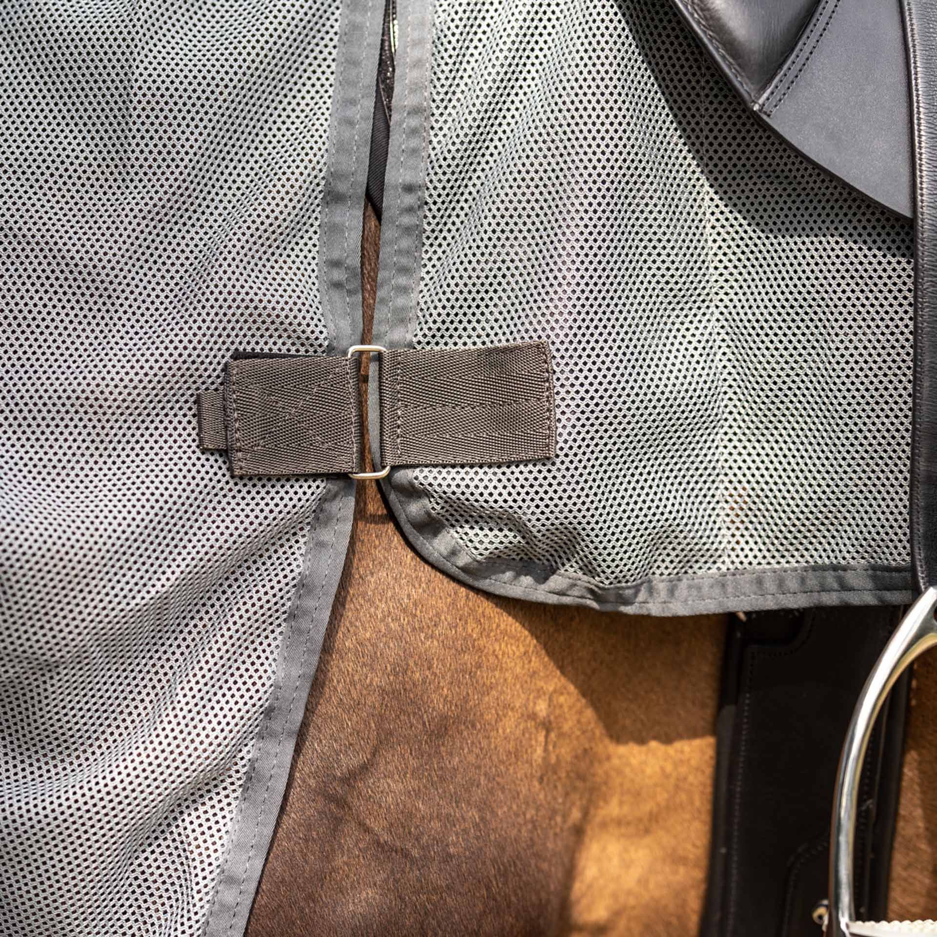 Partea gâtului este ușor detașabilă prin închiderea lacrimii, permițându -vă să reglați acoperirea în funcție de condiții. Designul include o „tăietură de călărie” pe partea laterală care permite o comunicare neîntreruptă cu calul tău și o deschidere pentru șa, concepută pentru șei britanice, care pot fi poziționate sub șa. Închiderea lacrimii pe Garre și acoperirea cozii cu o curea înaltă în spate oferă o potrivire personalizată și stabilă. Cu Busse acoperit de mersul Flex Fly III, vă puteți bucura de o plimbare fără să vă faceți griji pentru muște.