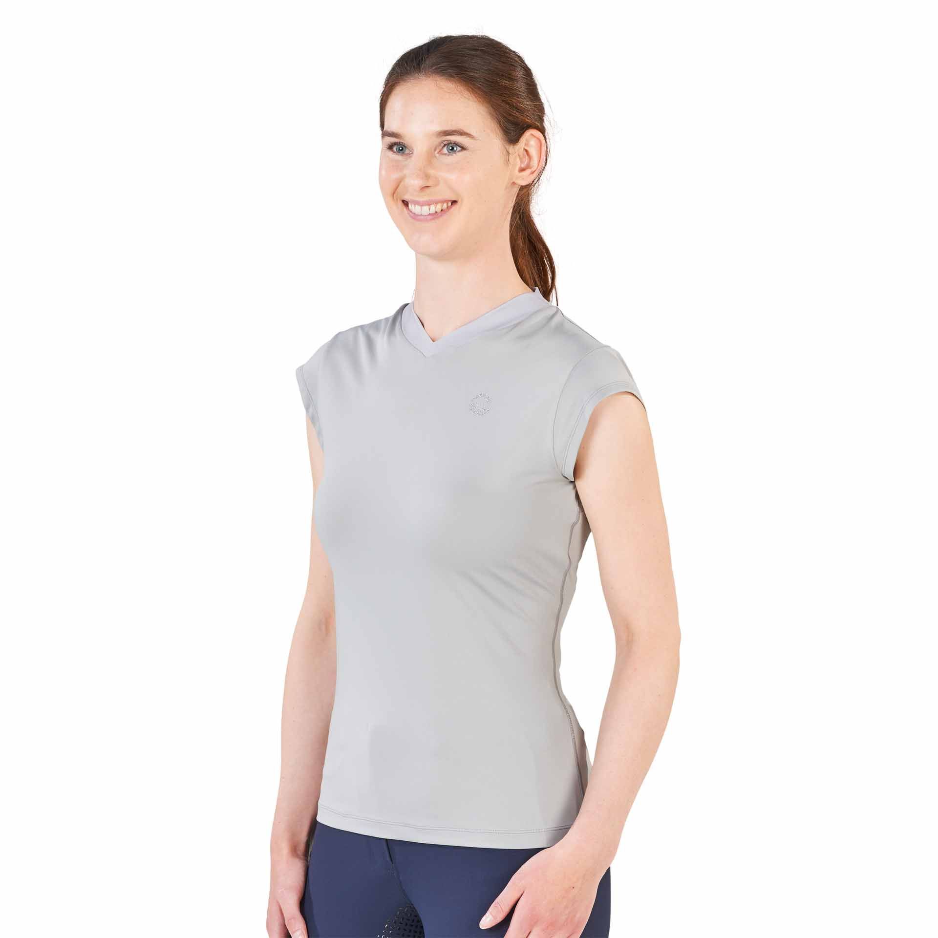 The Elli Tech T -Shirt are un design elegant V -neck, un decor în strasuri pe pieptul stâng, cusături profilate pentru un aspect feminin și mâneci de fluture. Materialul este rezistent la pilule și își menține forma chiar și după multe spălări, se usucă rapid și nu necesită călcare.