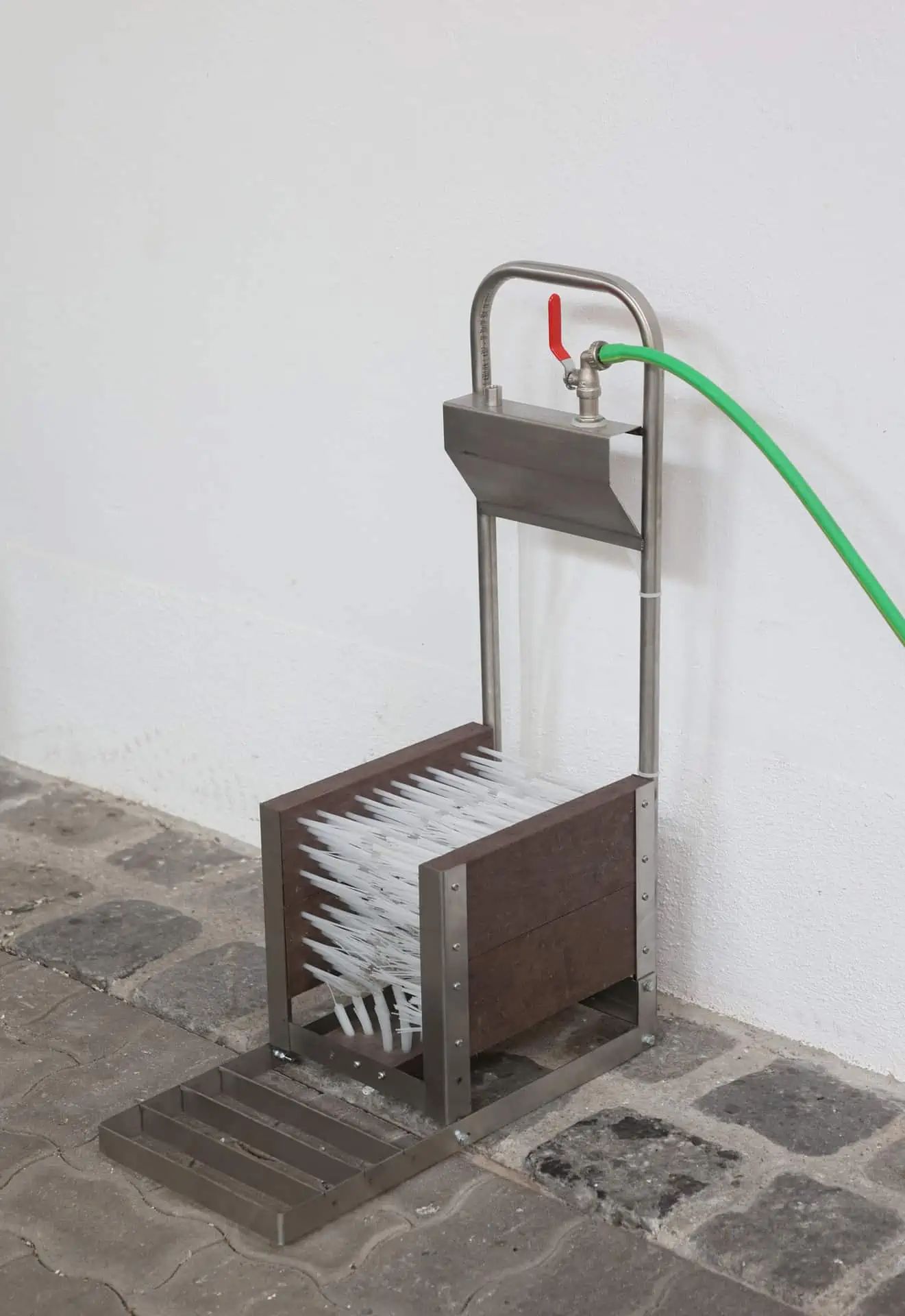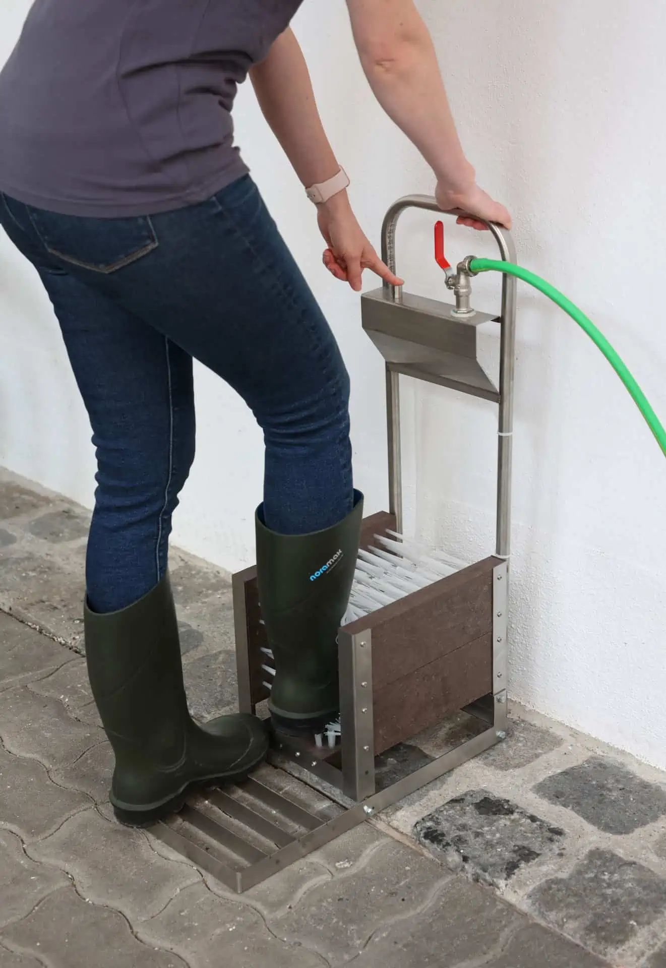 Kerbl Boot Cleaner oferă curățarea fără efort și minuțioasă a cizmelor de muncă. Are o conexiune la apă și o opțiune de conectare pentru curățare sau dezinfectant. Este, de asemenea, un alunecare și cu picioarele sigure și are o versiune robustă din oțel inoxidabil. Un cadru de bătaie și cinci perii robuste asigură curățarea completă.