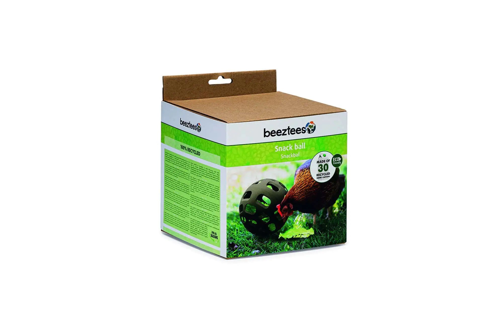 The Chicken Snack Ball is made of 100% recycled plastic, produced from approximately 30 drink cartons.