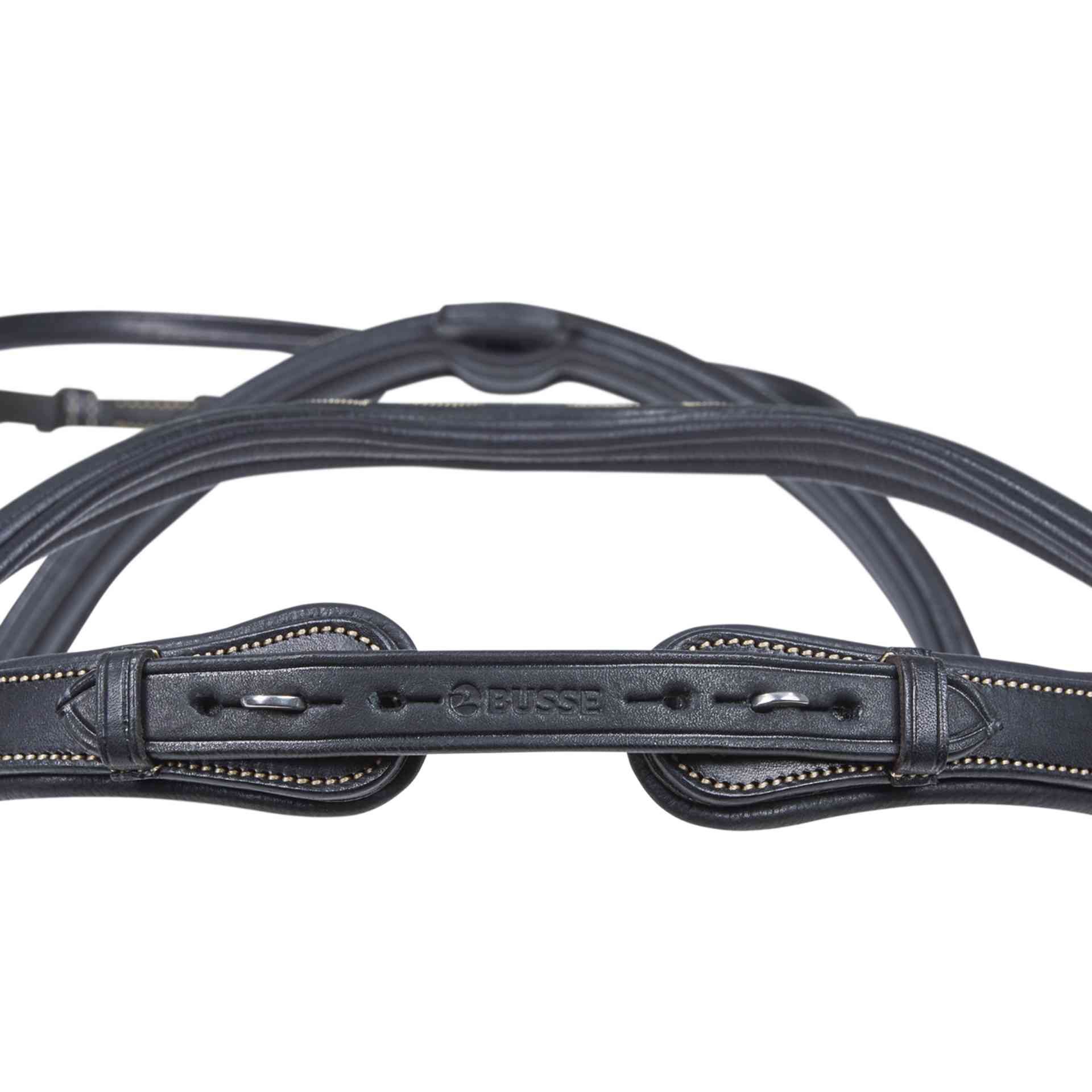 The modern and flexible design of the BUSSE Bridle TAKE-OFF LINE AD allows for the noseband and throatlatch to be easily attached and detached as desired. Crafted from the finest American leather, which is characterized by its high quality and soft feel, this bridle is particularly supple and comfortable on the horse's coat. In addition, the predominantly vegetable-tanned leather scores with its sustainability and durability.