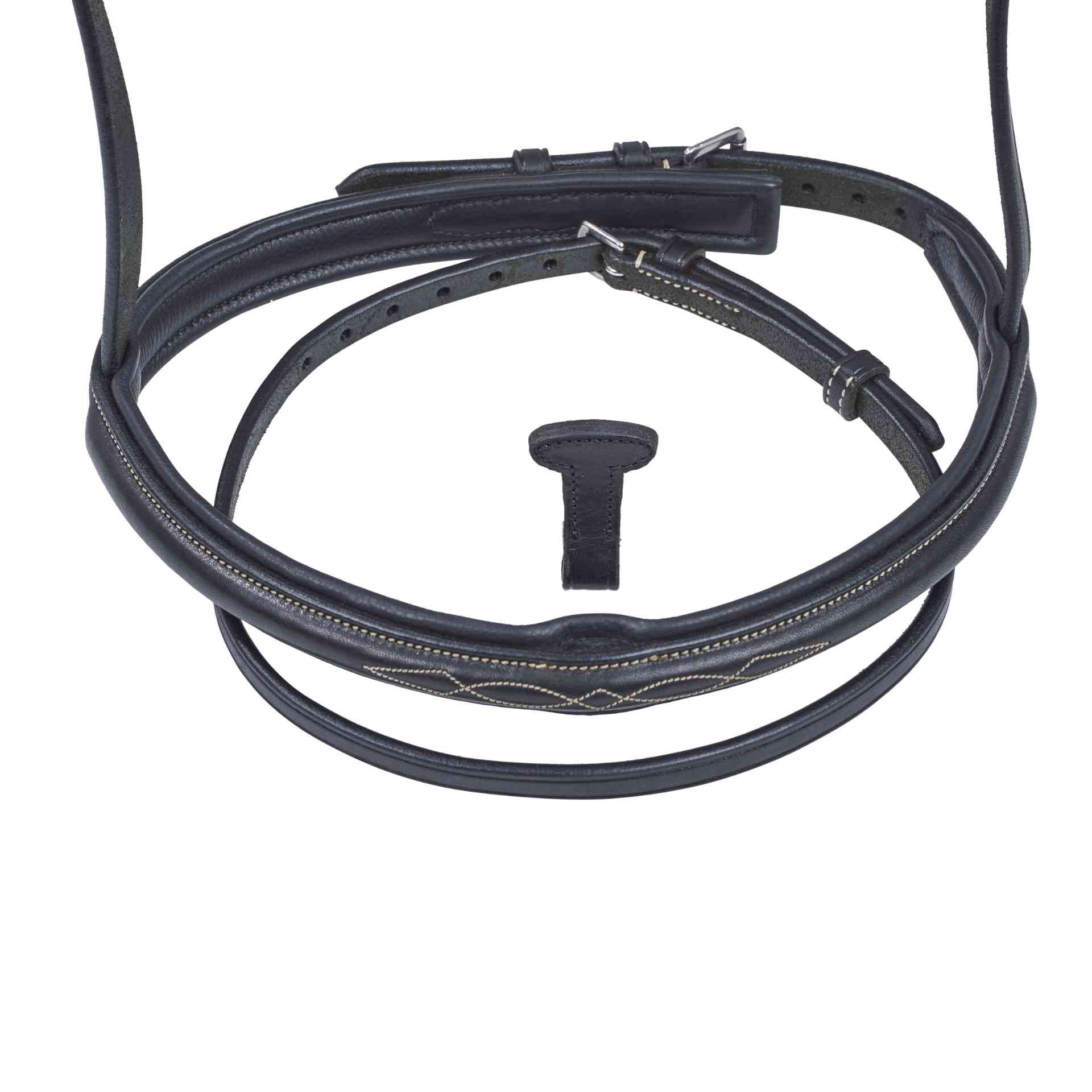 This bridle is ideal for riders who value comfort, flexibility, and style. The high-quality stainless steel fittings and the included grippy web reins with martingale stops, leather stops, leather ends, and coordinated decorative stitching complete the package.
