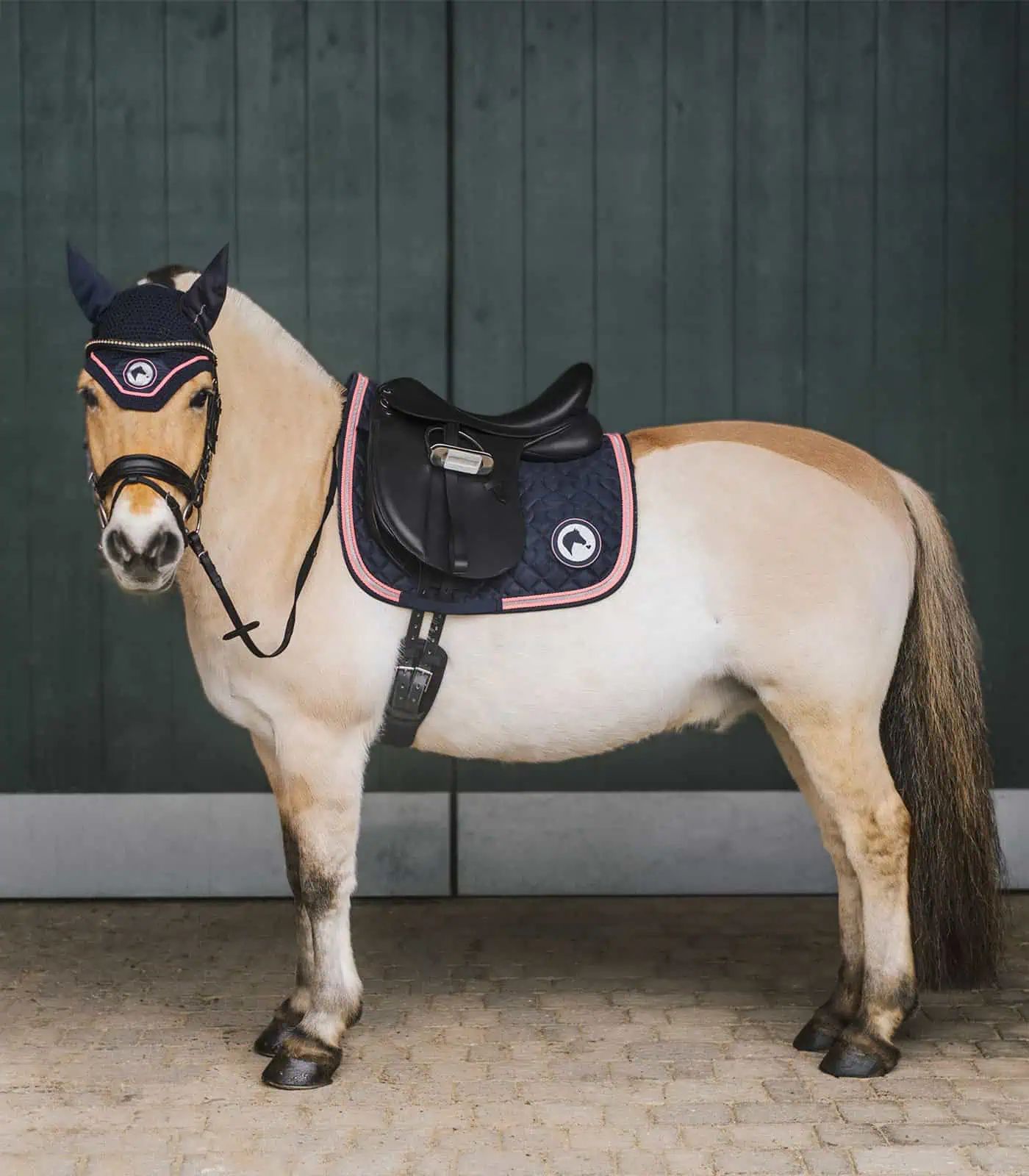 Quality saddle pad with little hearts quilting and silvery glitter cord. A cute glitter kiddies" motif is a finishing touch. 200g/m² padding and 10 mm special foam ensure optimum pressure distribution and shock absorption.