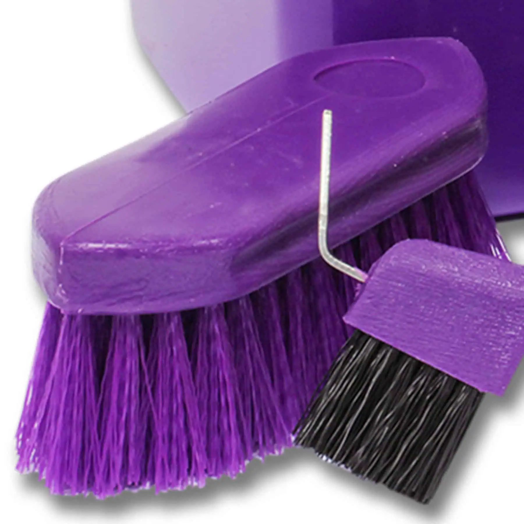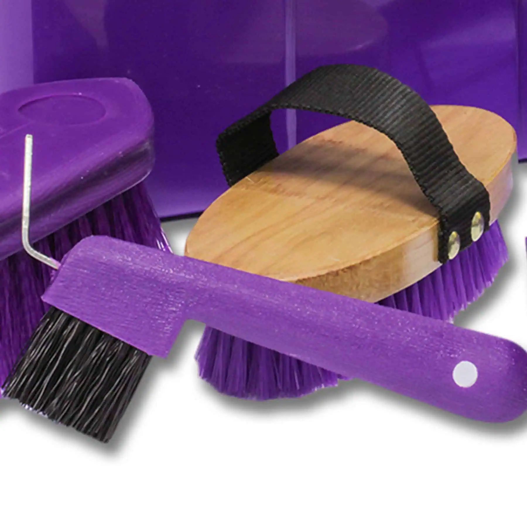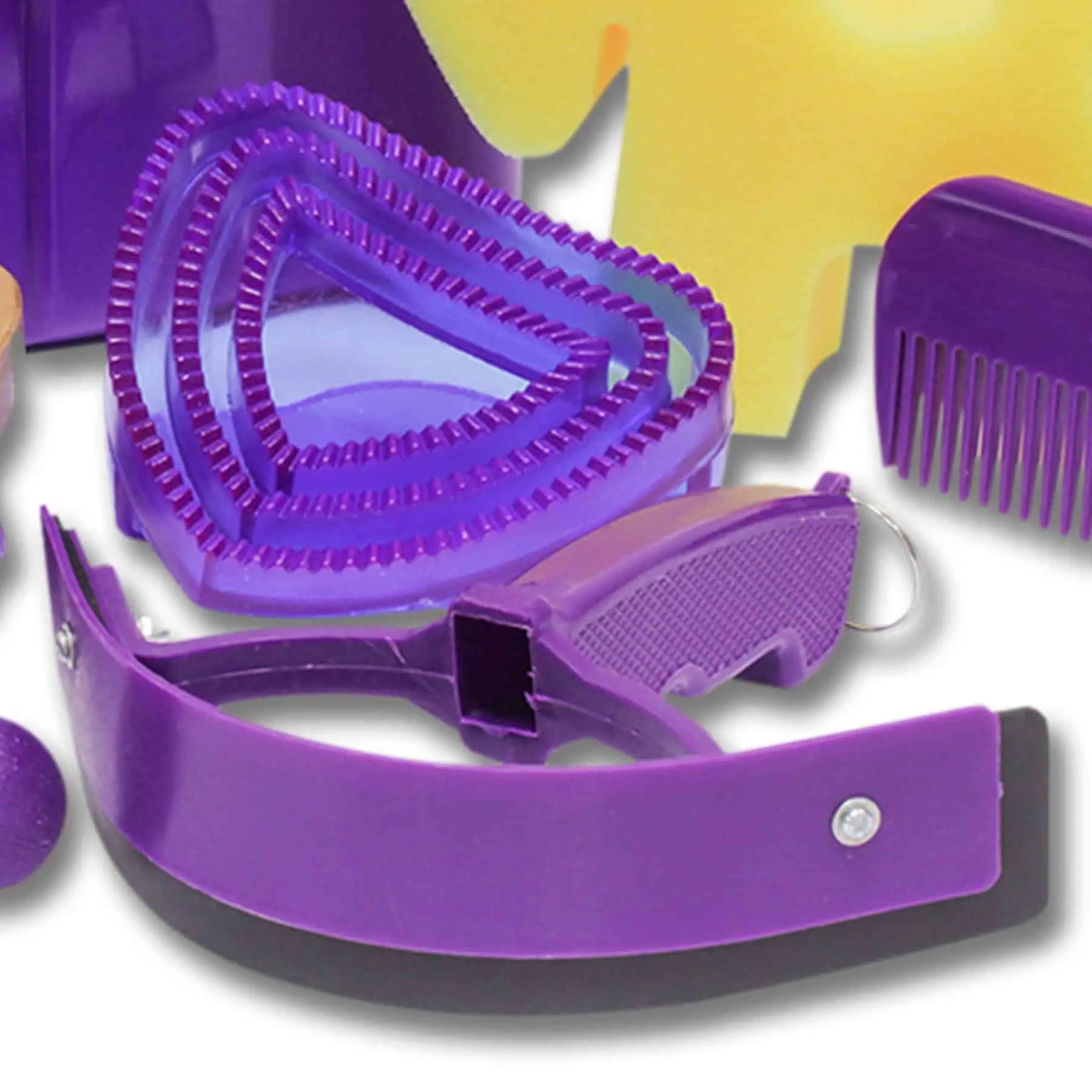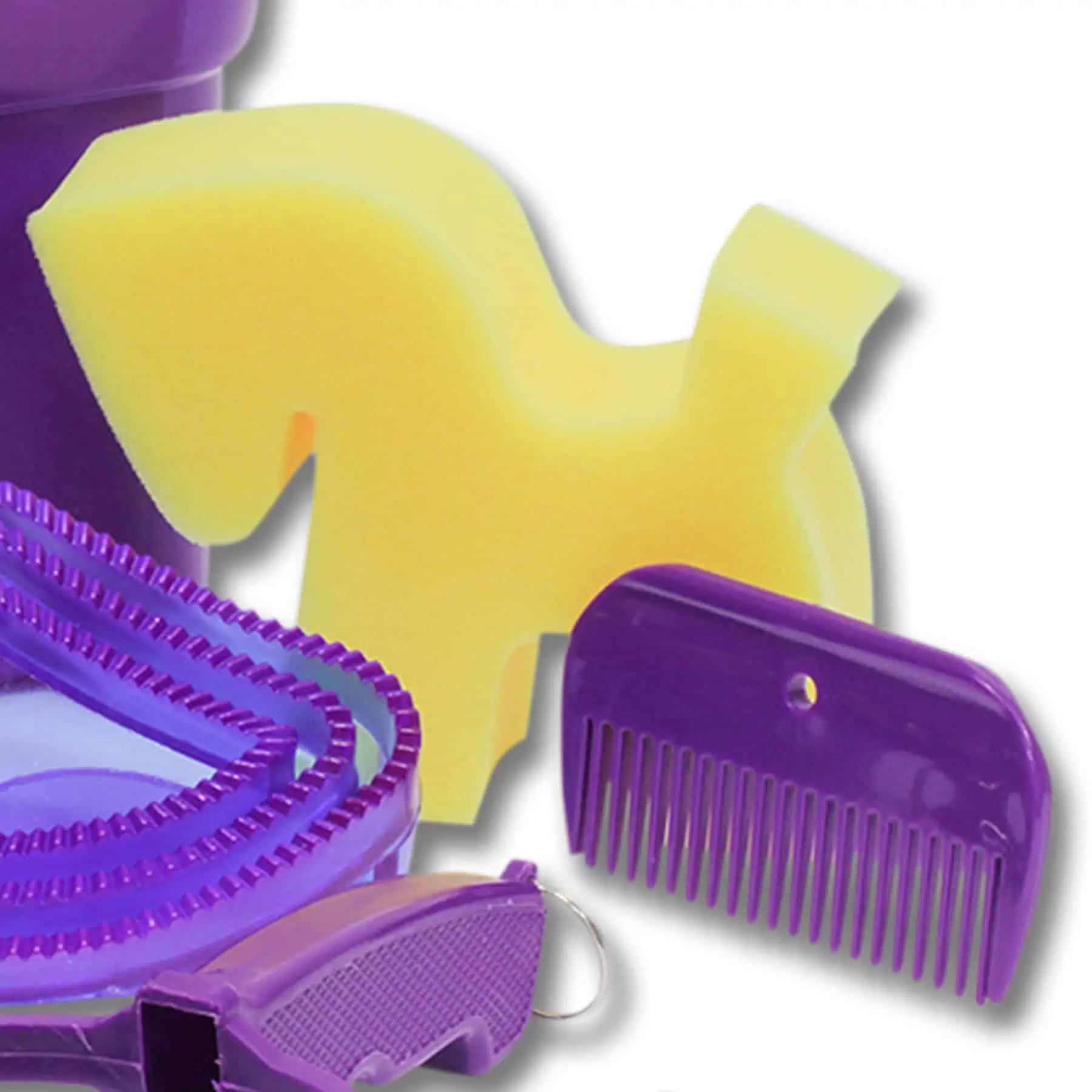 Extensive care-set, supplied in a smart box. With removable compartment for small items and a handle. Comes with body brush, brush, mane comb, hoof pick, heart shaped curry comb, sweat scraper and horse shaped sponge.