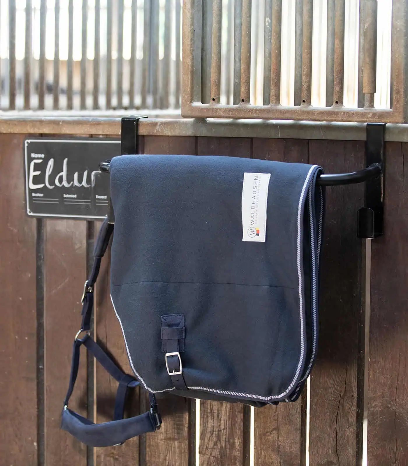 Size-adjustable rug holder in robust, coated metal. No drilling necessary! Simply hang up! This also makes it an optimum competition companion. For storing rugs, incl. 2 halter/bridle holders to keep things tidy in front of the stable door.