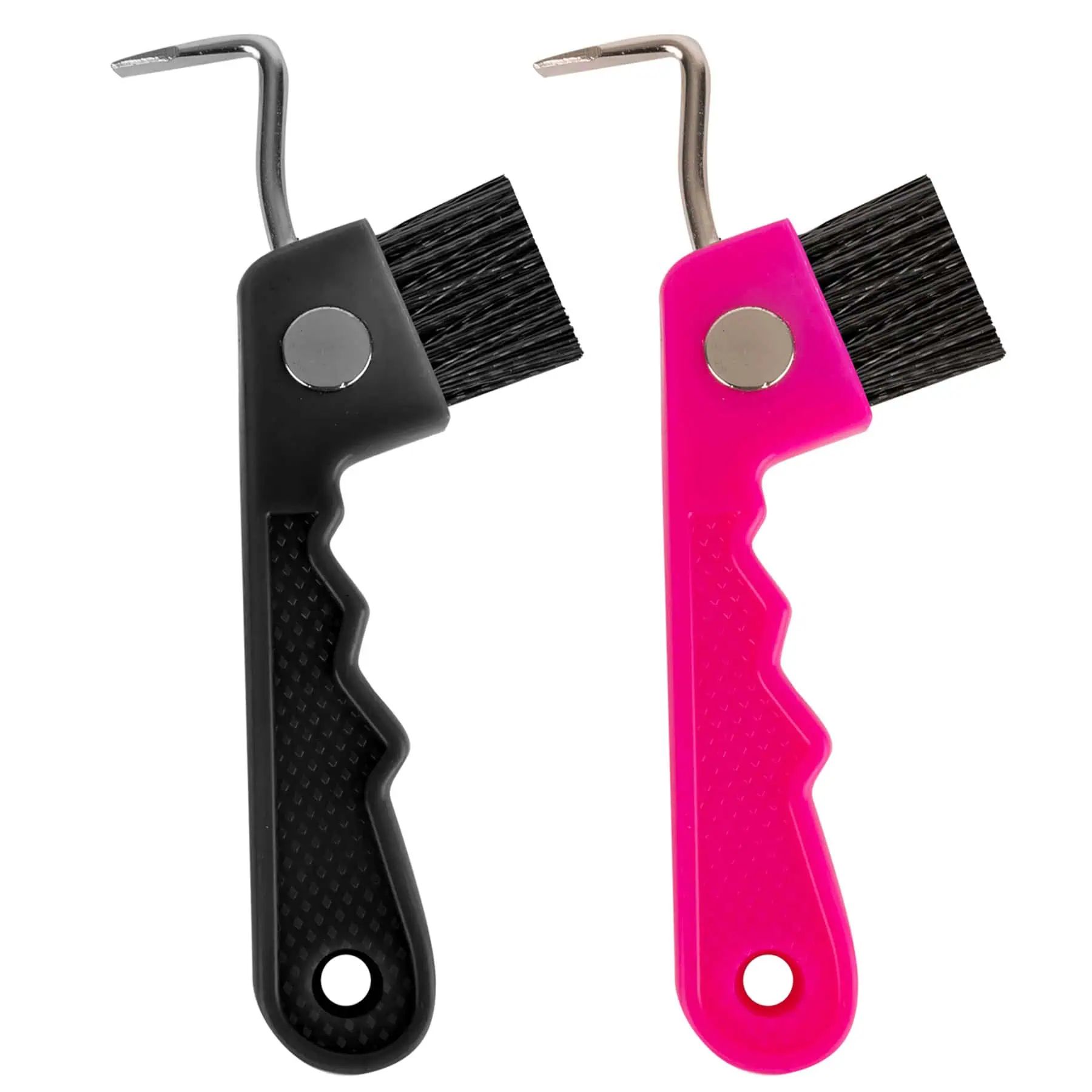 Hoofpick with magnet for attaching to stall or other magnetic surfaces.