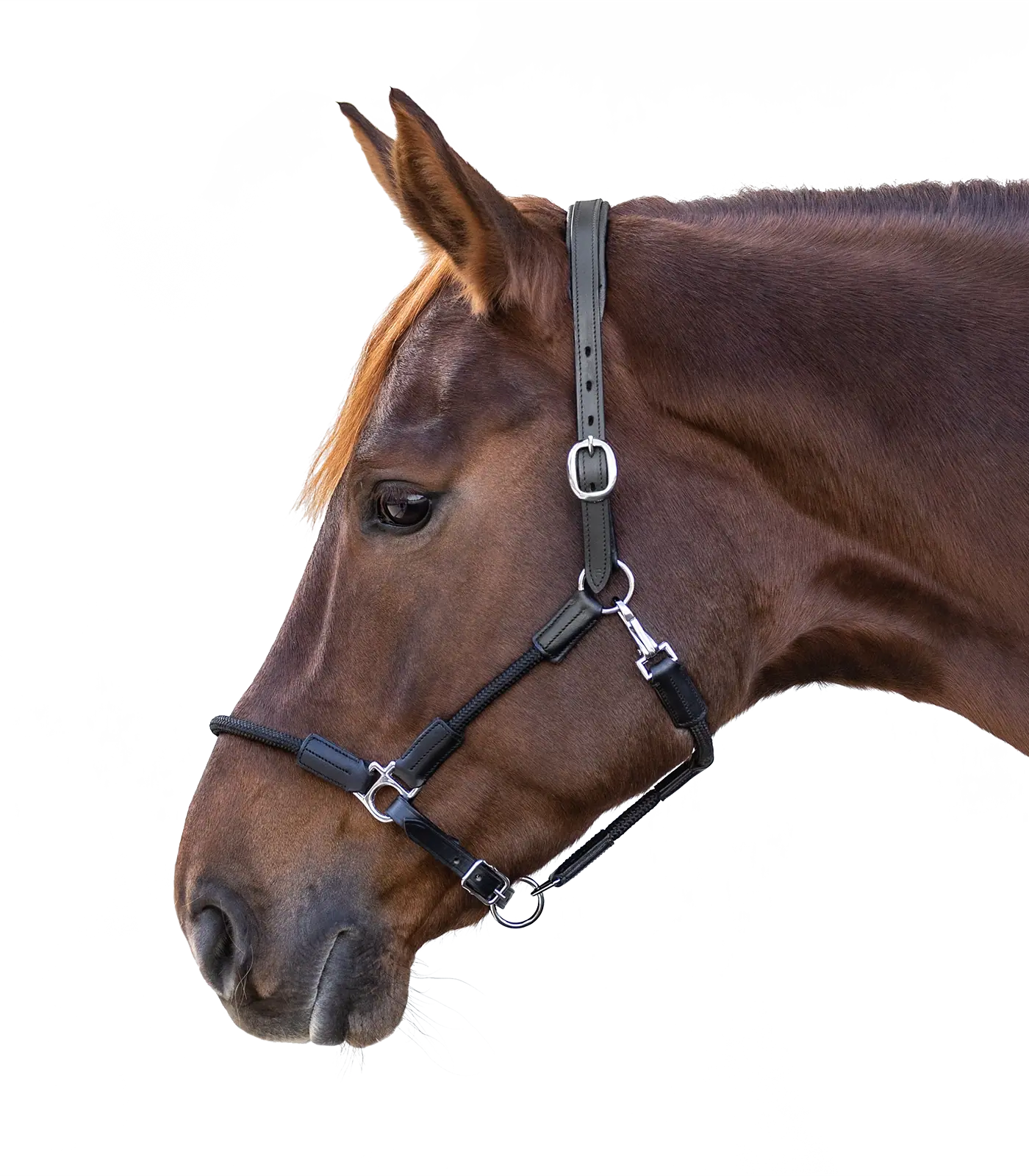 Attractive leather halter with soft leather in headpiece area and attractive rope accents. Easy to adjust at headpiece as well as chin strap.