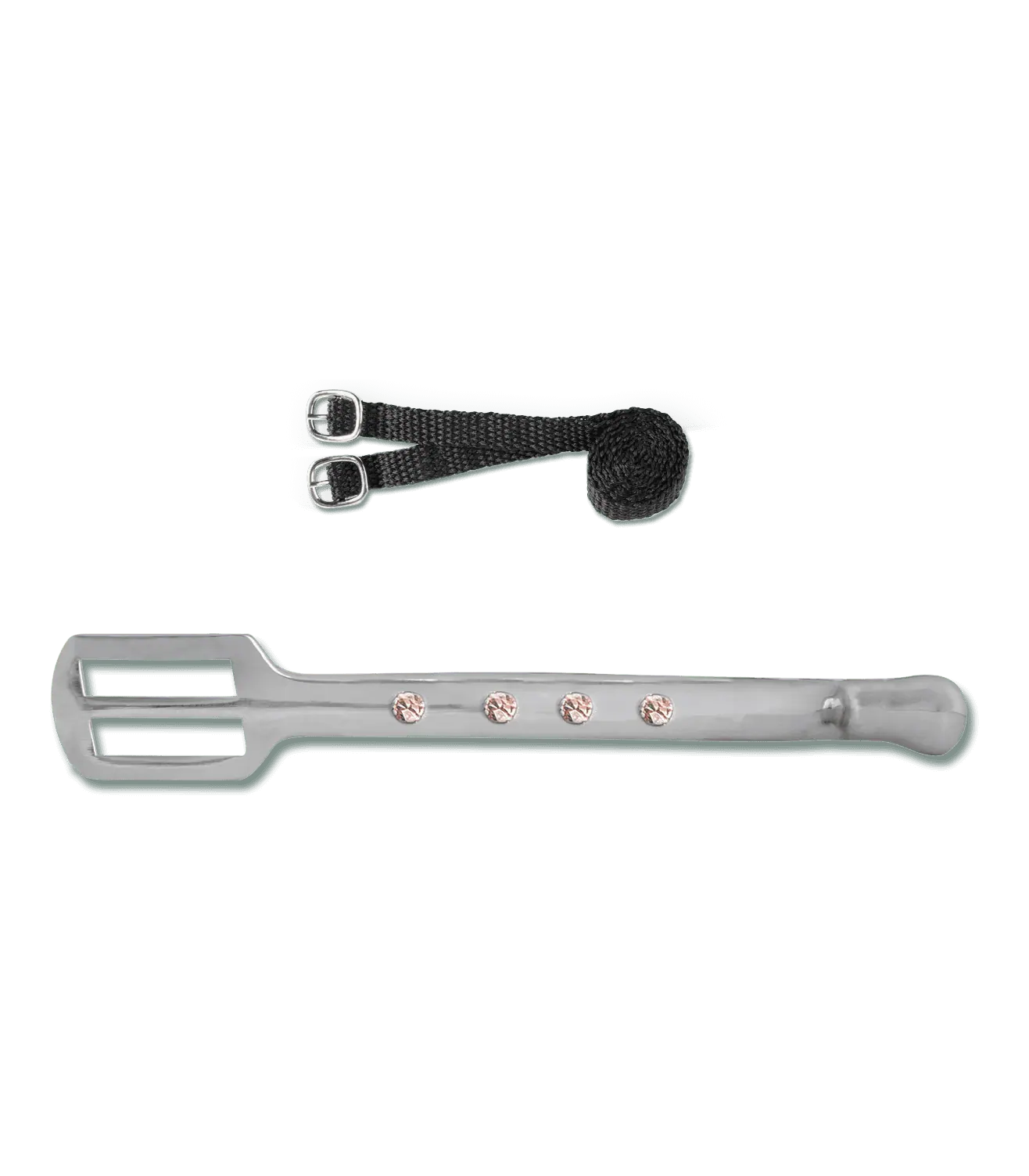 Spurs with shank, set with rhinestones on the outside. With perlon spur straps, rust-proof, pair.