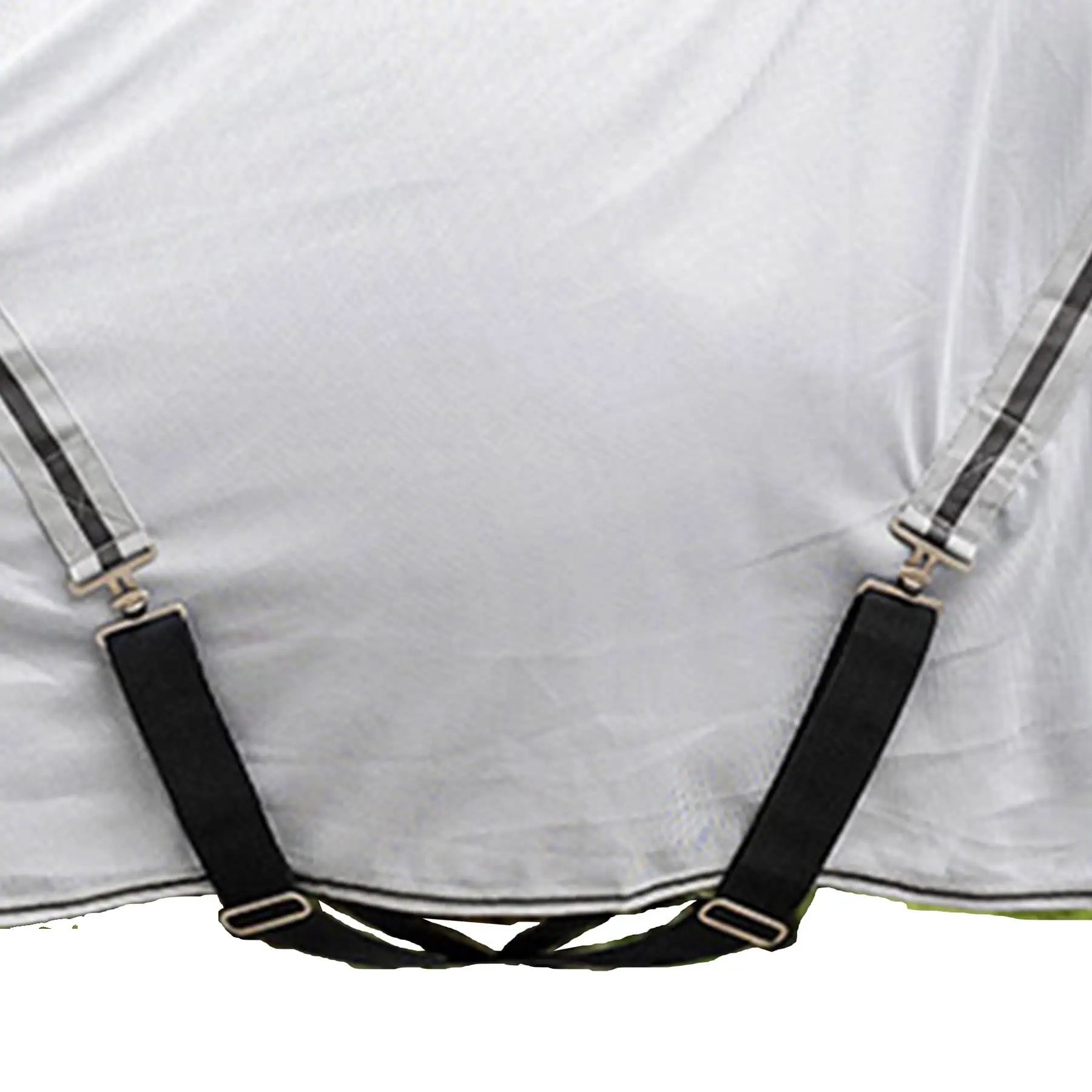 High quality fly rug made of finely woven fabric, featuring cross straps and a tail flap to protect against annoying insects. Double front fasteners, kick pleat, fillet string and leg straps ensure a good fit. Supplied with detachable neck part to protect neck and mane.