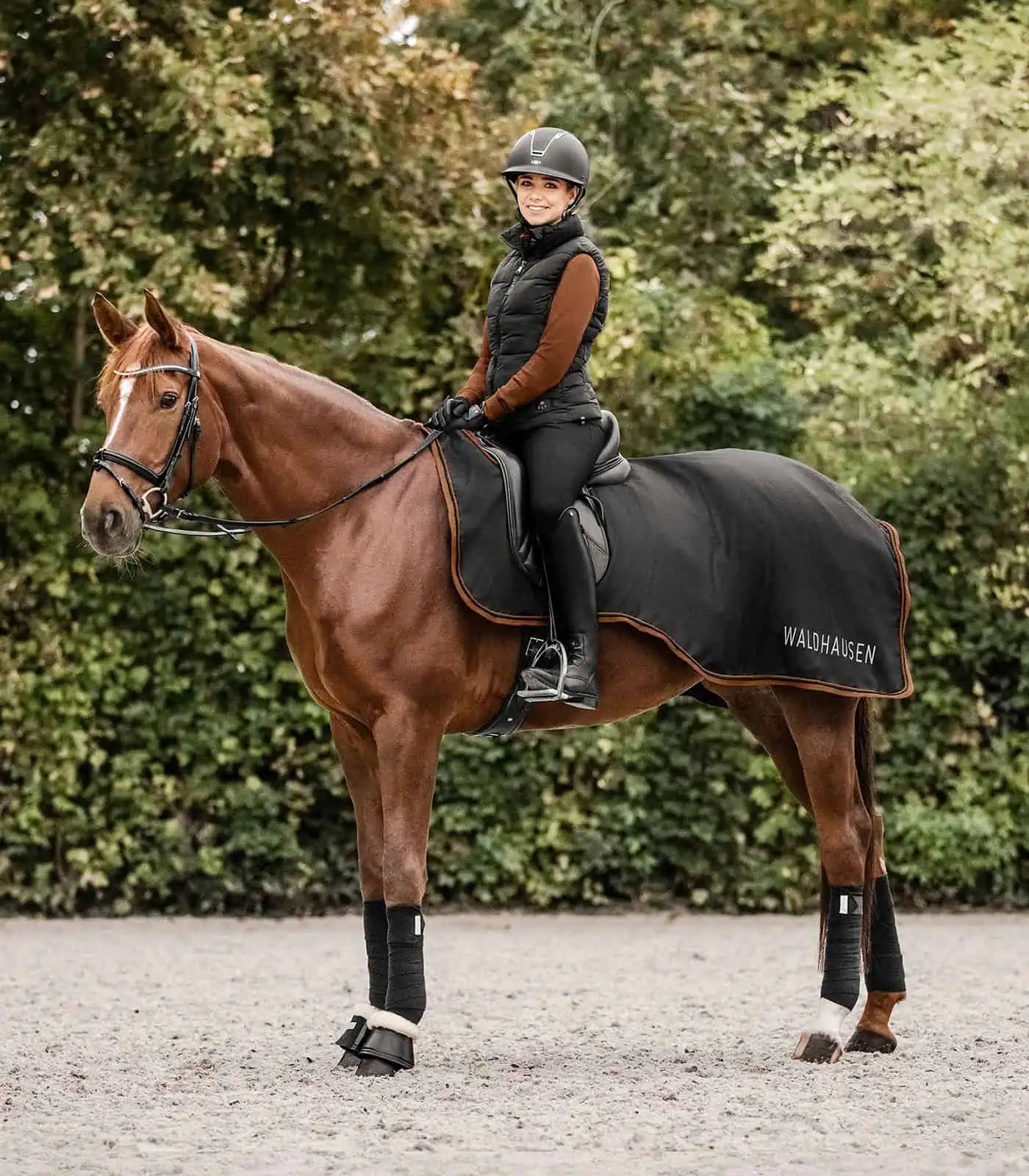 Waterproof, 600 denier exercise sheet with warming 50g/m² filling.The reflective lettering of the Waldhausen logo ensures good visibility. With a cut out for English saddles. Touch tape fastener in the withers area for ease of attachment.