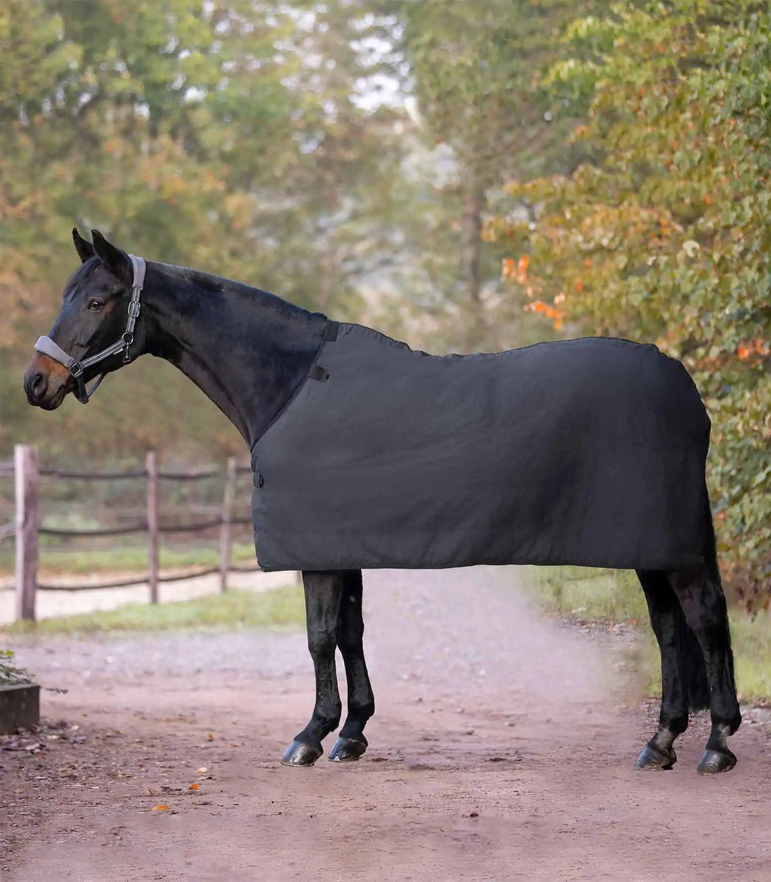 Warming, breathable underrug in antipilling fleece. Simple T-fastener on chest with elastic and touch tape cover. 2 elastic touch tape straps in shoulder area and at hind end for easy attachment to all Waldhausen outdoor rugs.