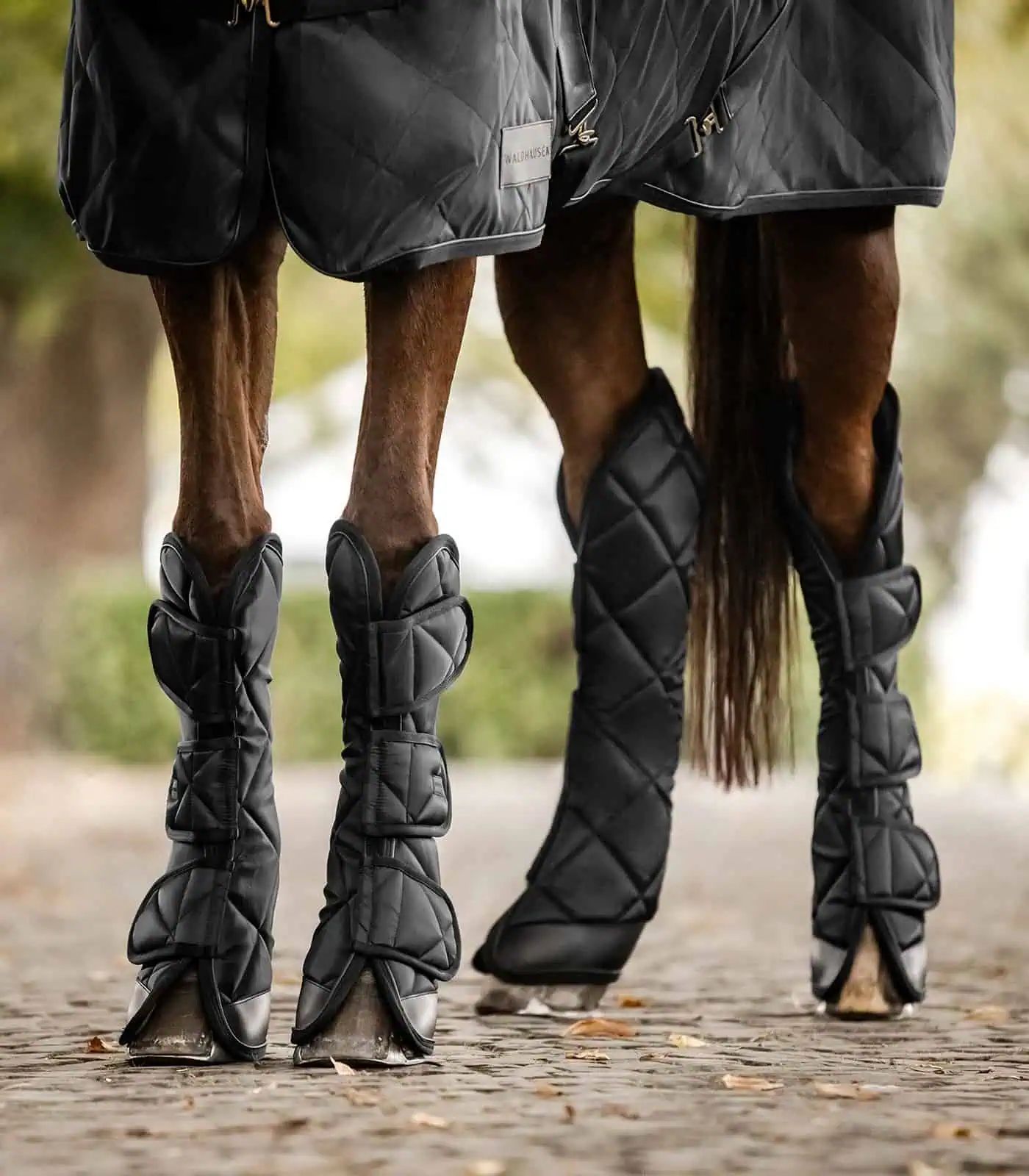 Anatomically shaped travelling boots with three strong touch tape fasteners for optimum hold on the horse"s leg. With shock-absorbing foam on the inside and artificial rabbit fur lining. With artificial leather reinforcement on the heel area.