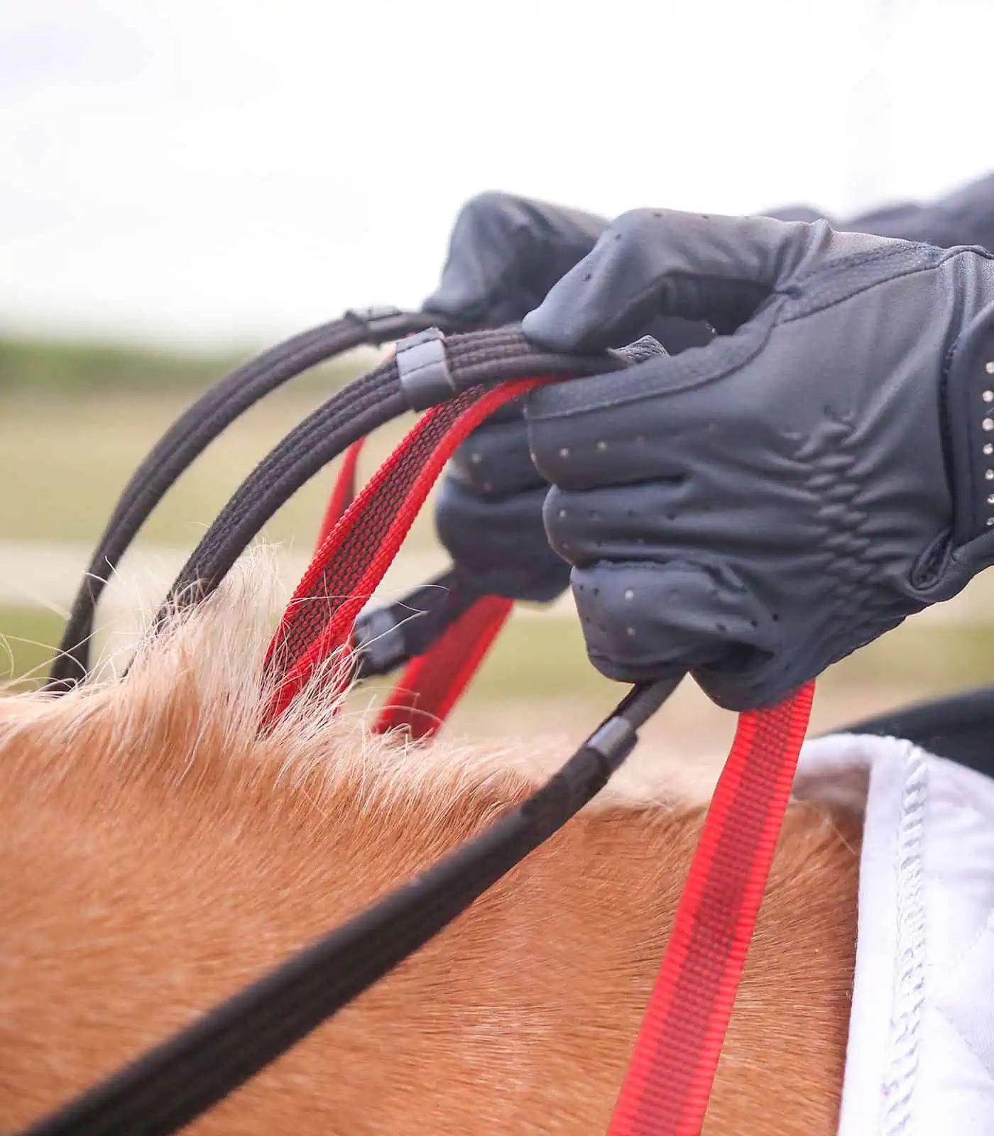 Furthermore, this combination can be used on young horses or ones difficult to control, which tend to sudden abrupt movements, in order to support the rider. When needed, the safety reins provide the rider with something to hold on to and act on the horse"s chest through being connected to the breastplate thus helps to re-establishing control over the horse.