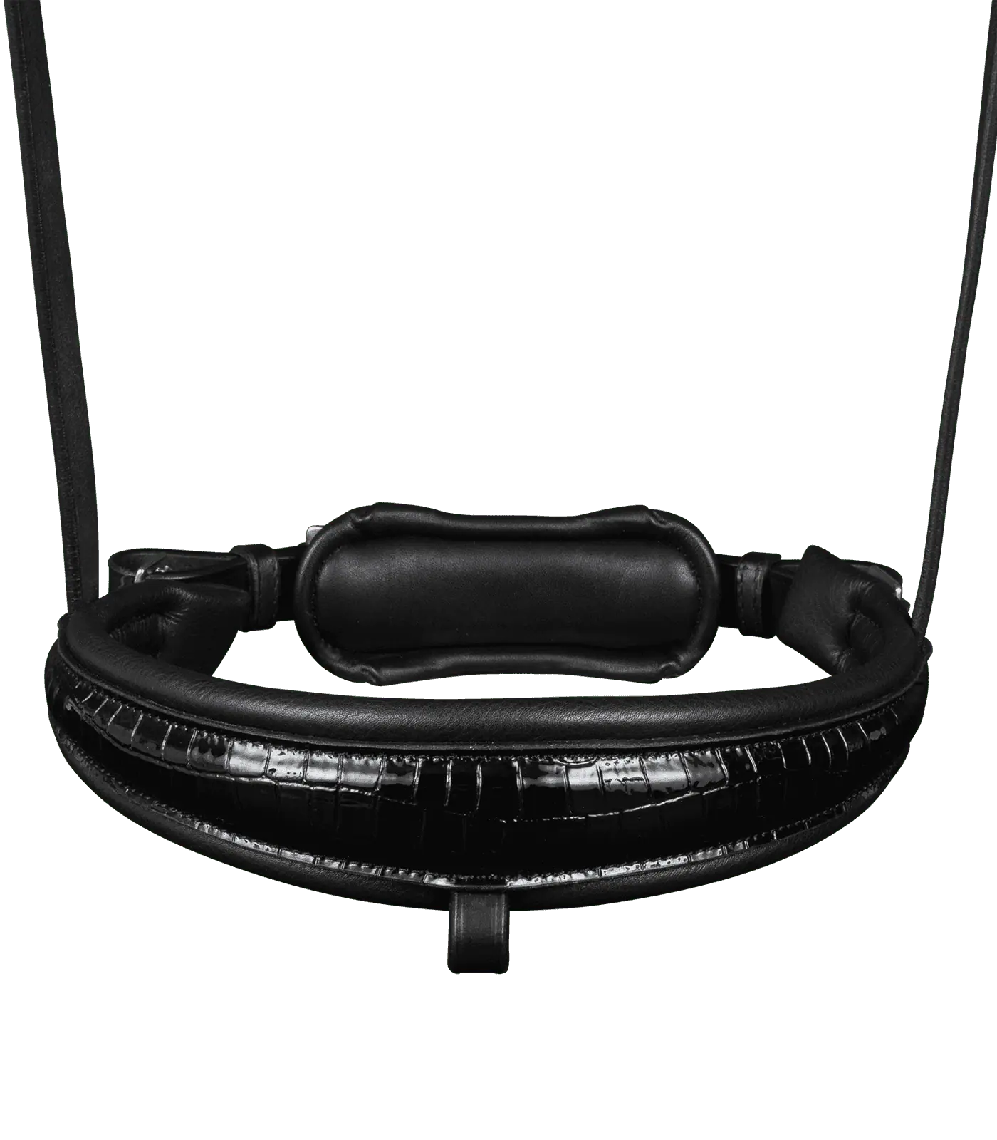- Flat-sewn noseband, cheekpieces and throat strap