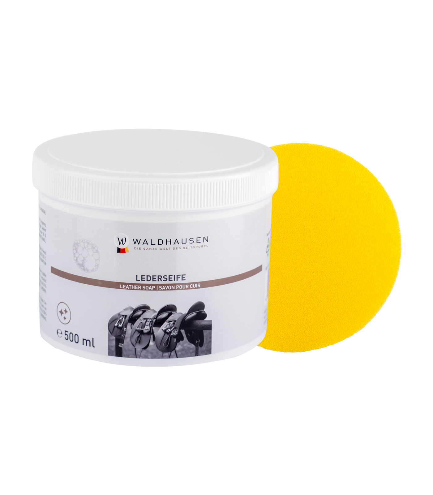 Saddle Soap with sponge. Moisturising leather soap with glycerine. Cleans, nourishes and preserves tack and leather goods.
