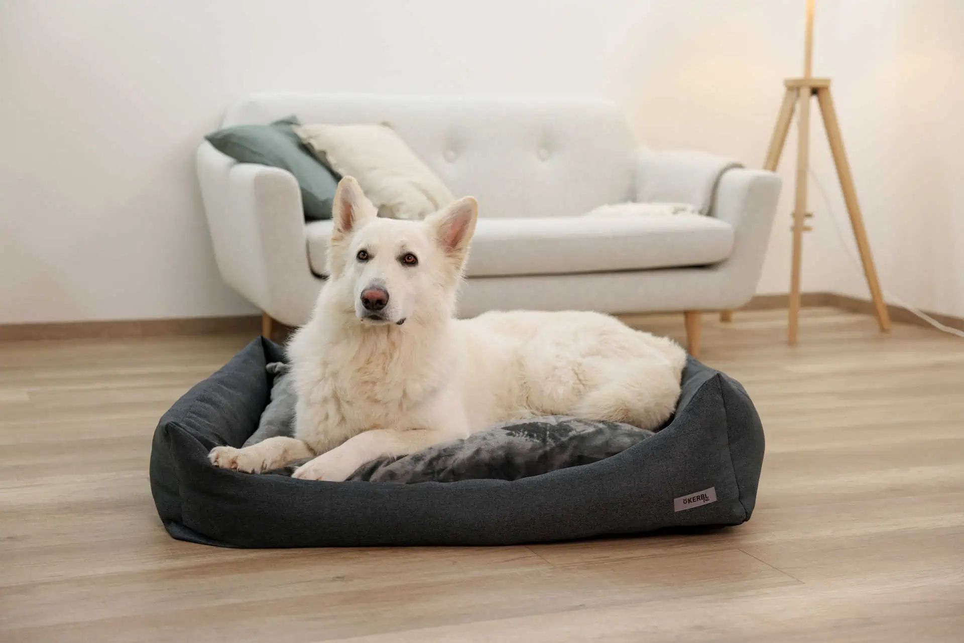 The Snugly Bed Platin Ortho is an orthopedic bed for dogs, specifically designed for older and sick dogs with joint or back problems. Thanks to its removable reversible cushion with high-quality memory foam flakes, it relieves pressure and offers maximum comfort. The thick padding excellently insulates against cold floors and provides a cozy feeling for the dog. The reversible cushion has different covers: soft plush on one side and robust woven fabric on the other, making it versatile.