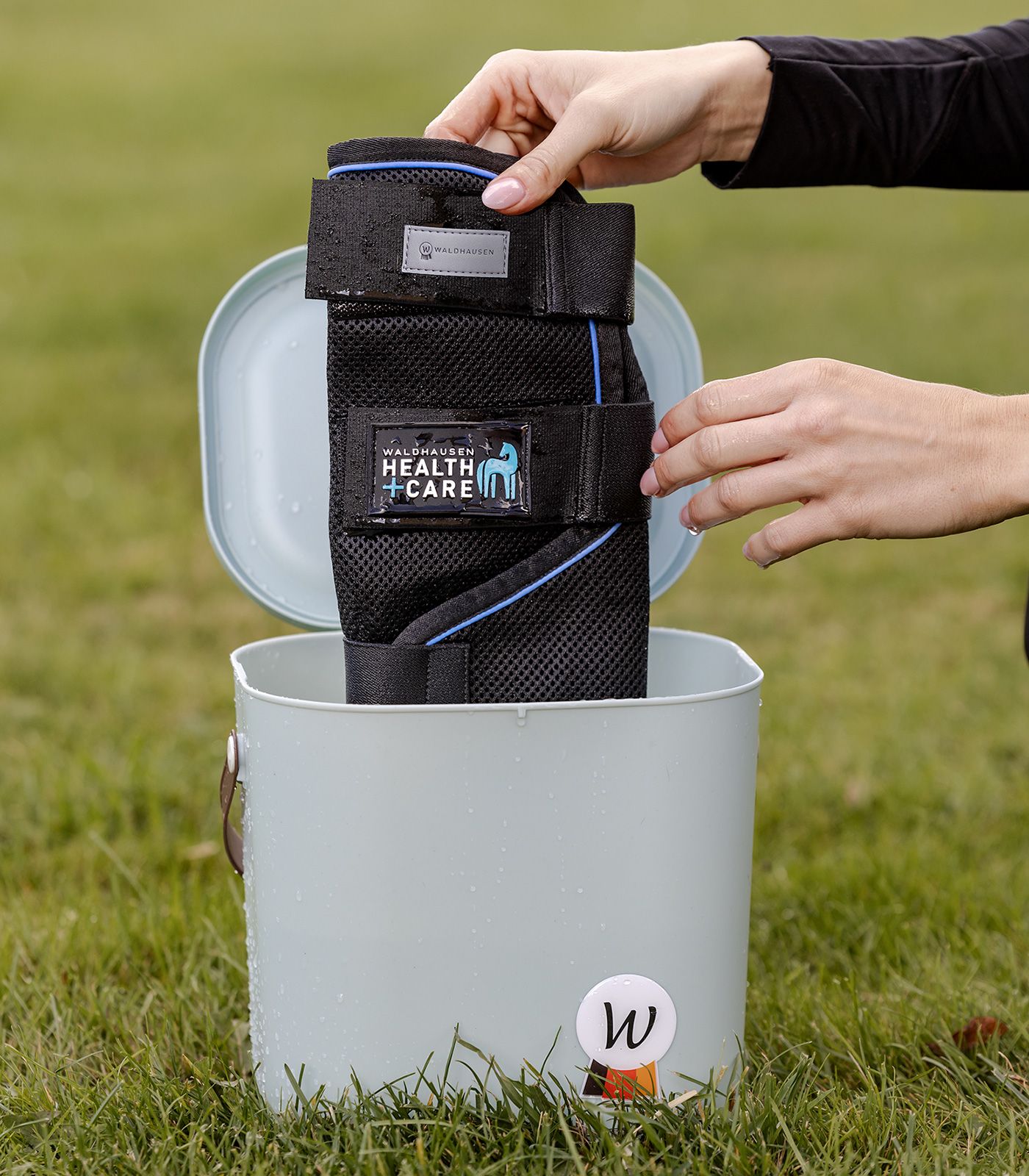 Immerse the tendon boots in cold water until completely soaked. Then wring them out well and place them around the horse's leg. Ensure the horse stands still and is not unattended during use.